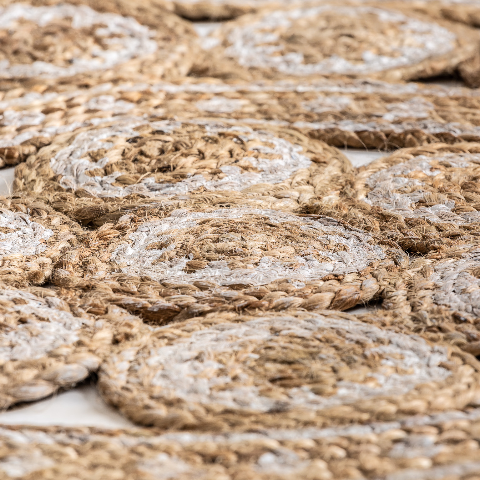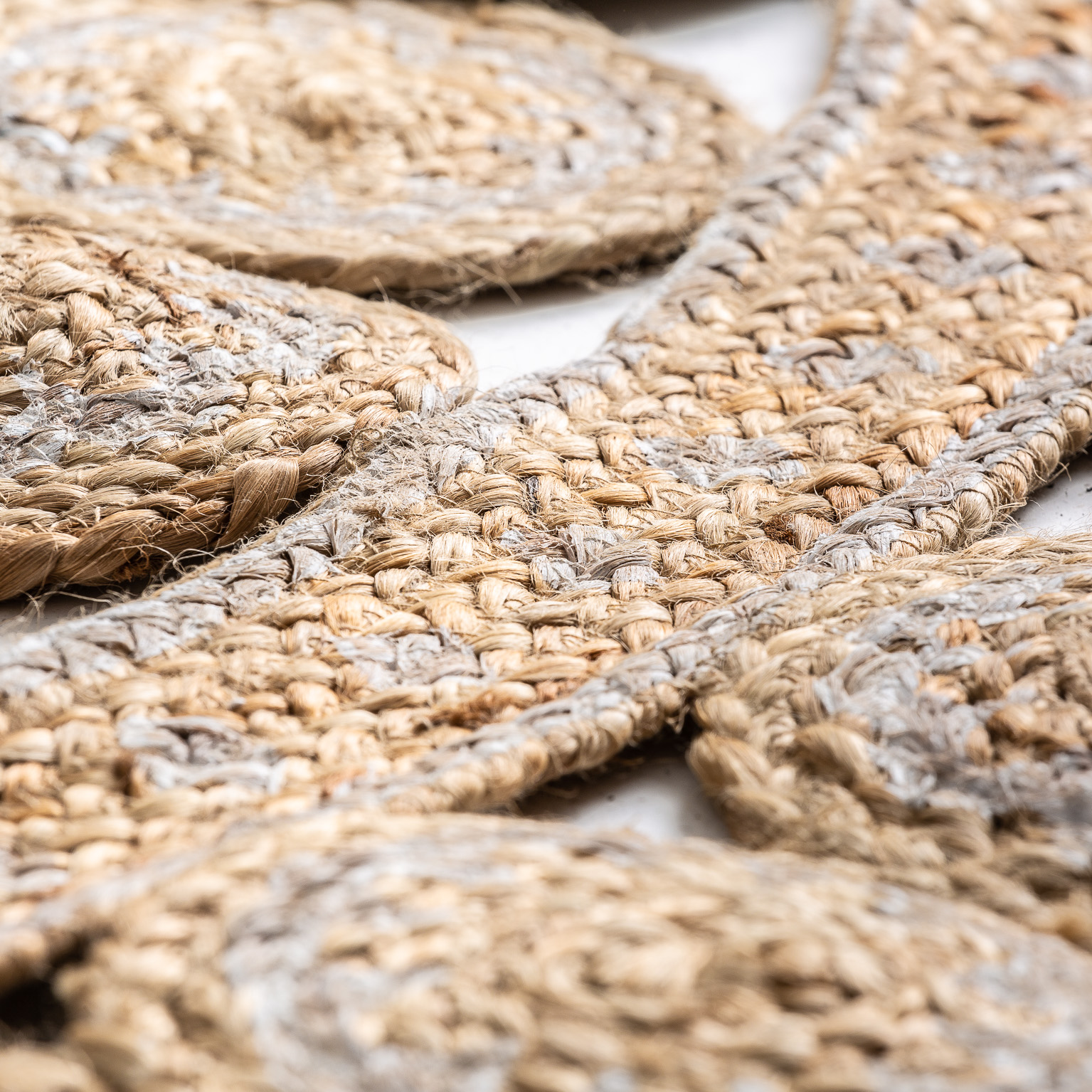 ALFOMBRA REDONDA ZULAI, EN COLOR ARENA, DE ESTILO ÉTNICO. FABRICADO EN CÁÑAMO, COMBINADO CON YUTE.