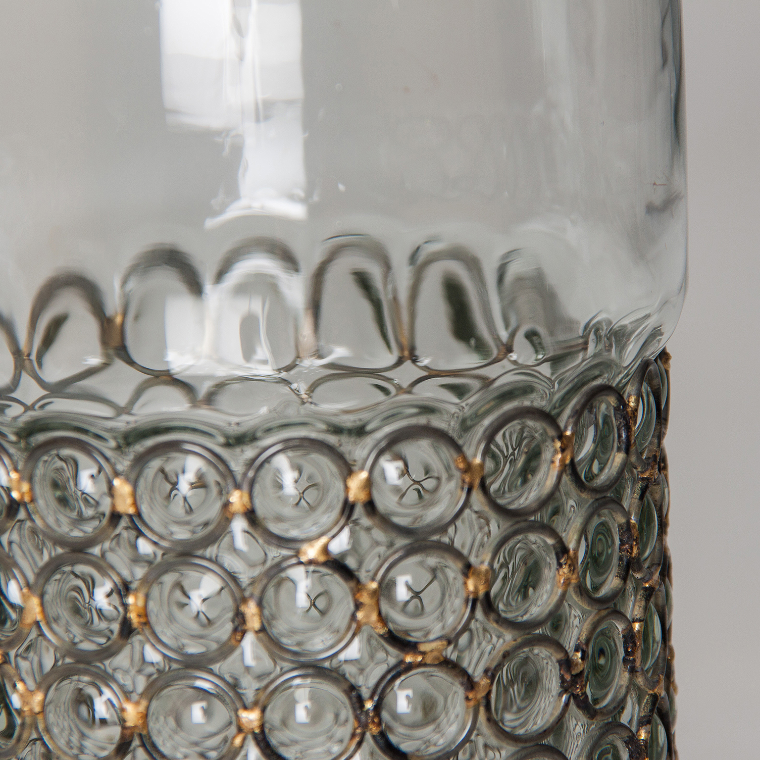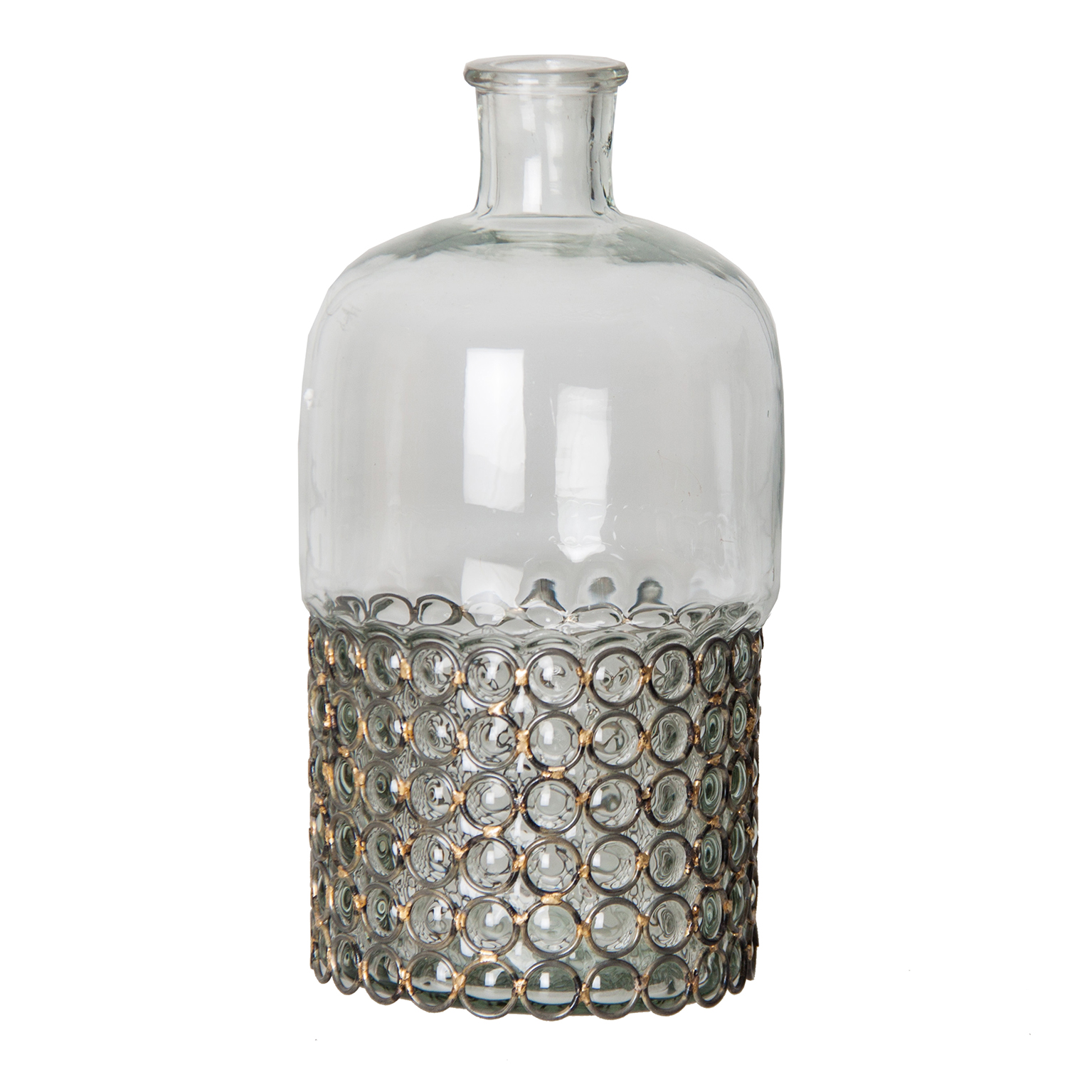 BOTELLA DECORATIVA EDEK, EN COLOR TRANSPARENTE ENVEJECIDO, DE ESTILO VINTAGE. FABRICADO EN VIDRIO. VIDRIO SOPLADO CON ESTRUCTURA METÁLICA.