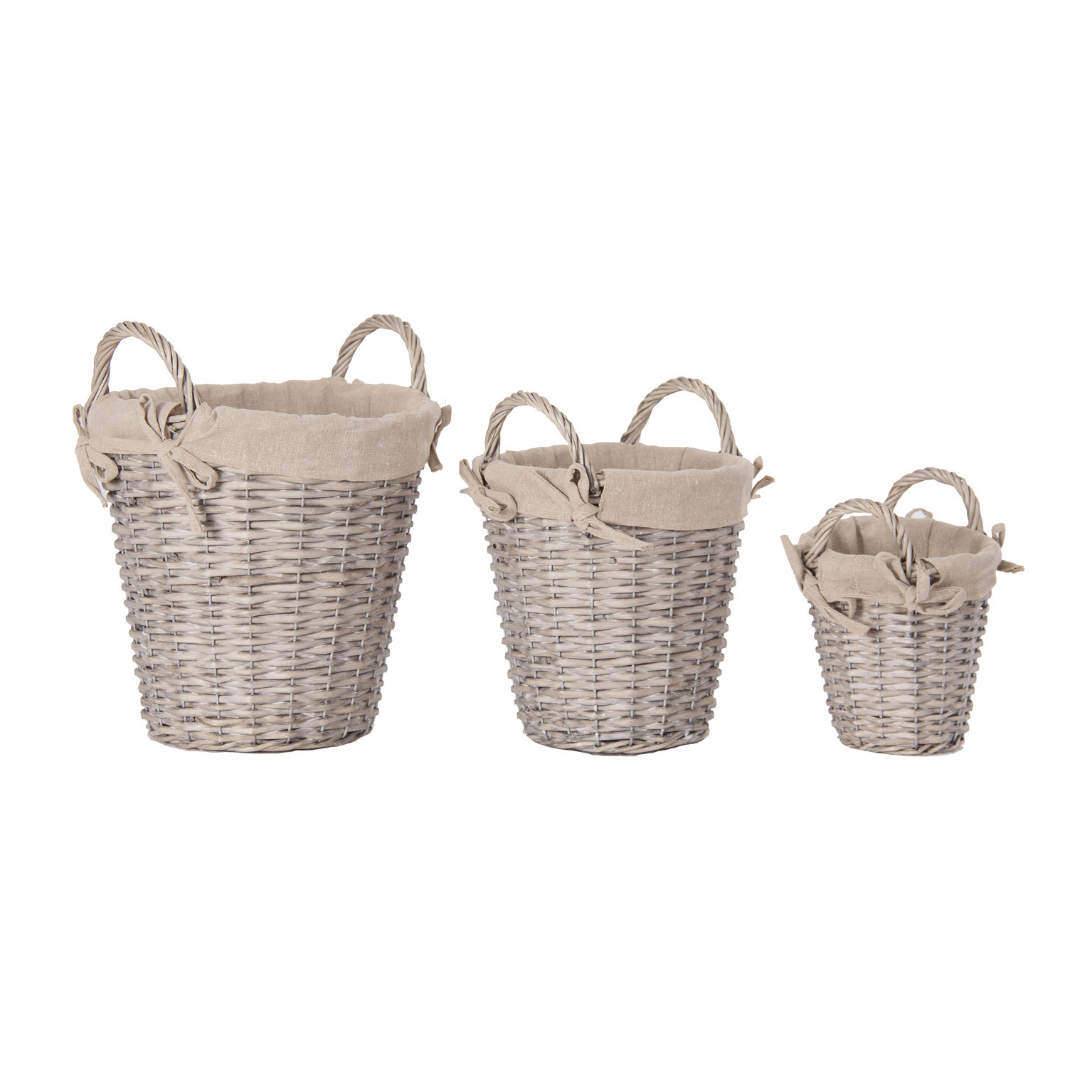 CESTA J/3 REDONDA, EN COLOR ARENA, DE ESTILO SHABBY CHIC. FABRICADO EN MIMBRE, COMBINADO CON LINO.