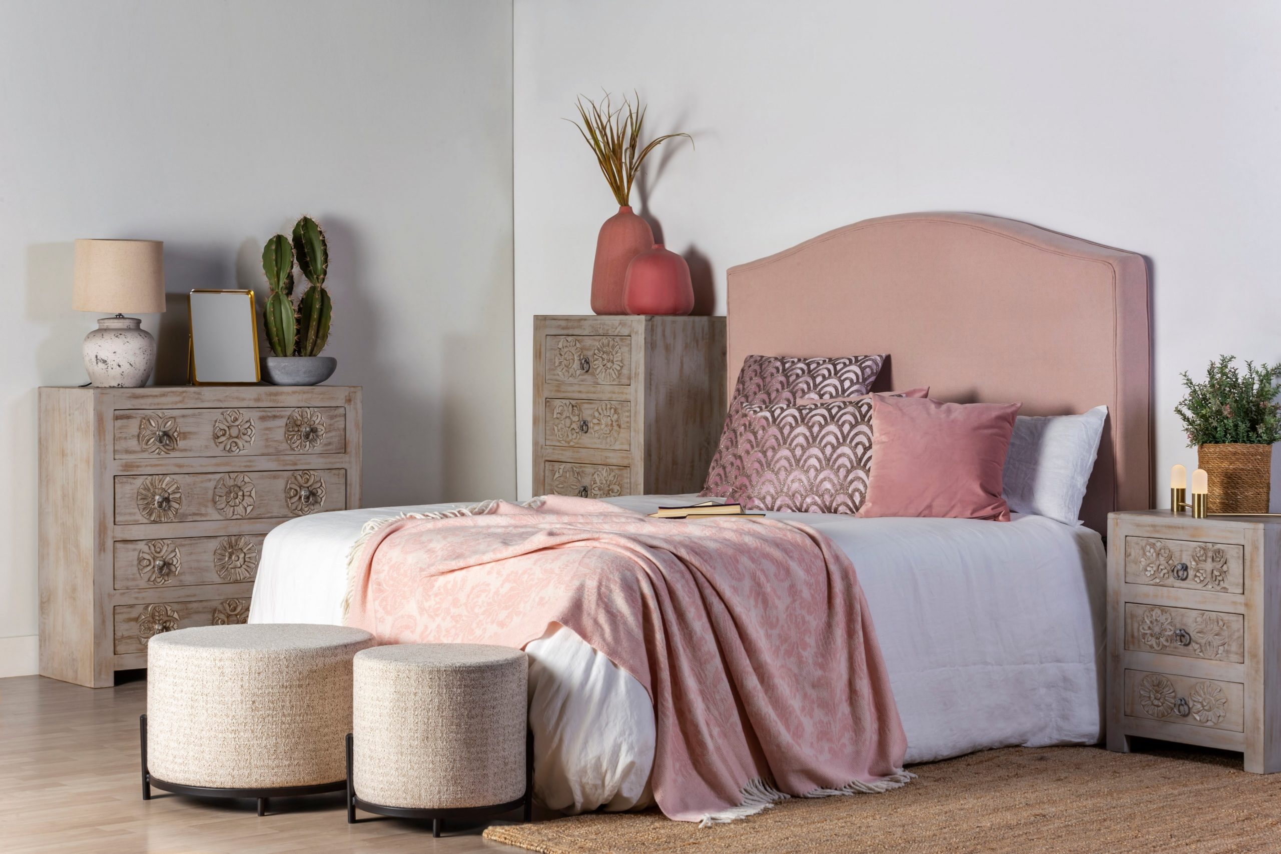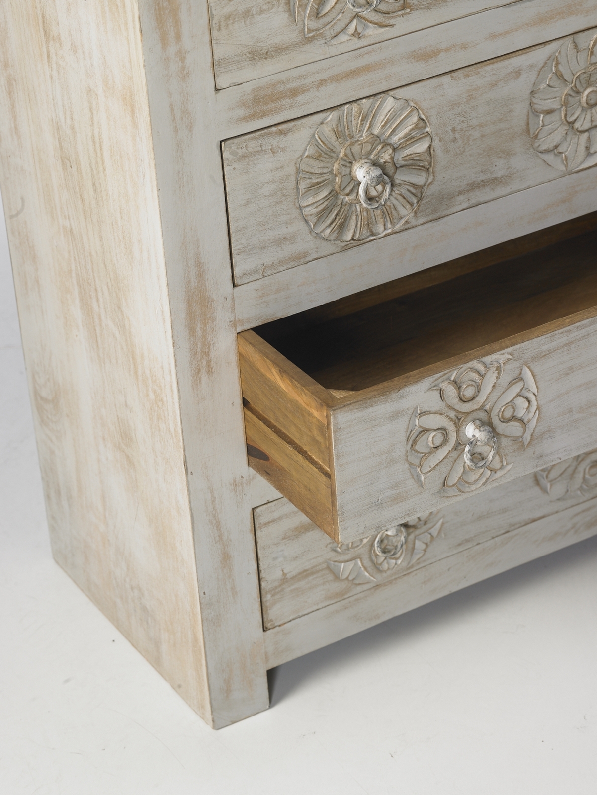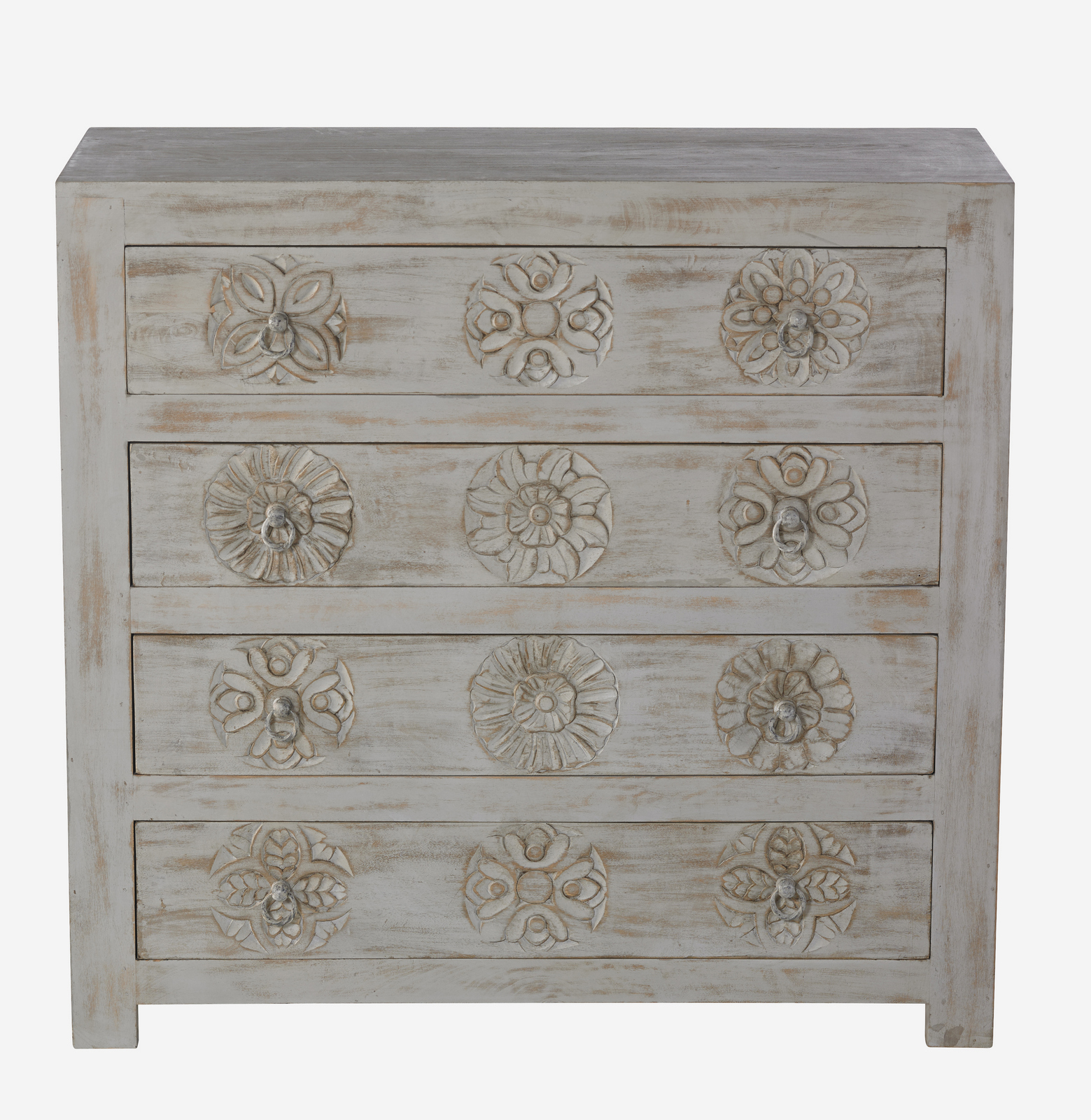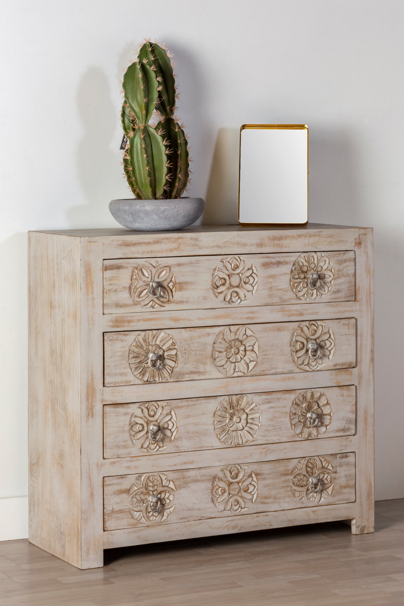 Este mueble tiene además unos originales grabados florales en la madera y cuatro cajoneras, lo que hace de ella una pieza no solo bonita, sino también muy funcional. Decídete por nuestra coqueta cómoda Kuai, en madera de mango envejecida, para dar un toque romántico y vintage a tu dormitorio