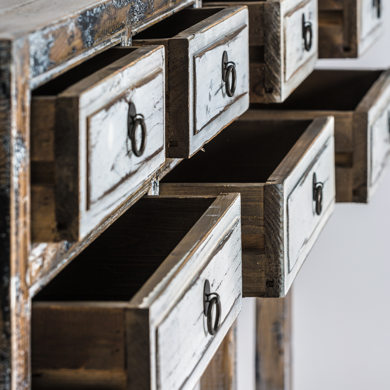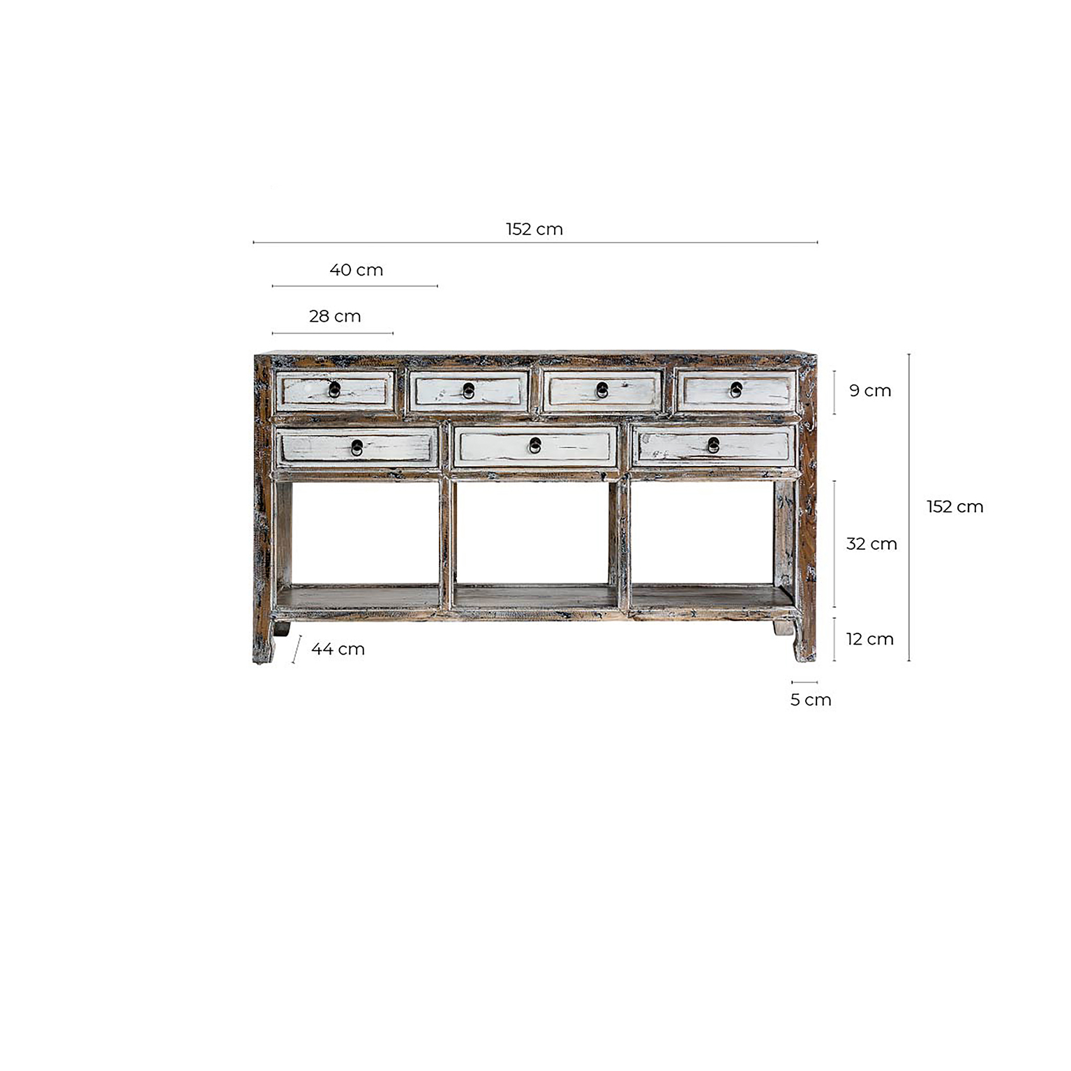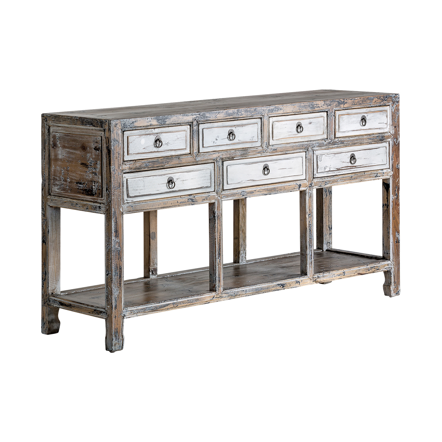CONSOLA VIBY, EN COLOR BLANCO ROTO ENVEJECIDO, DE ESTILO ORIENTAL. FABRICADO EN MADERA DE PINO RECICLADO.