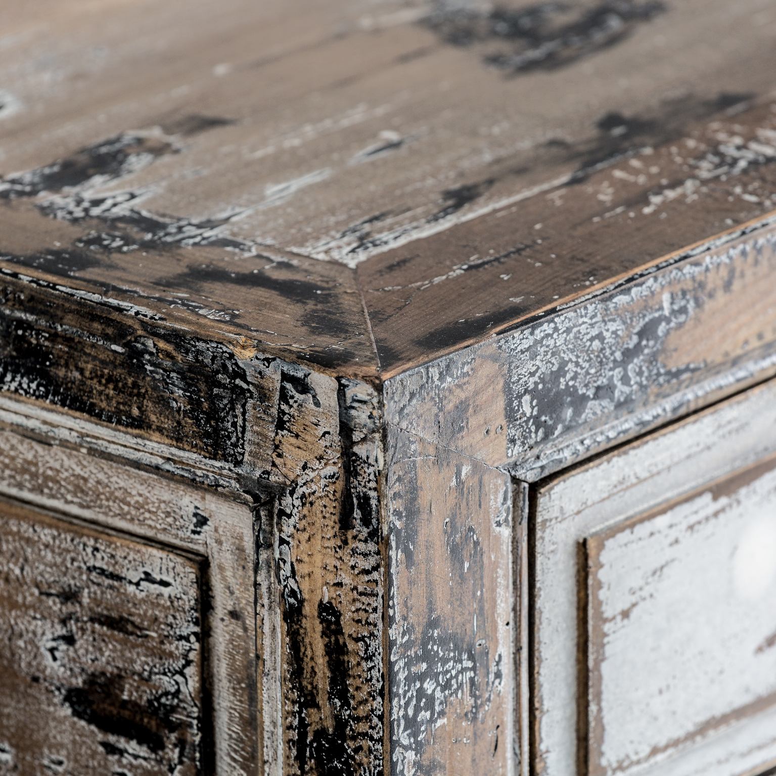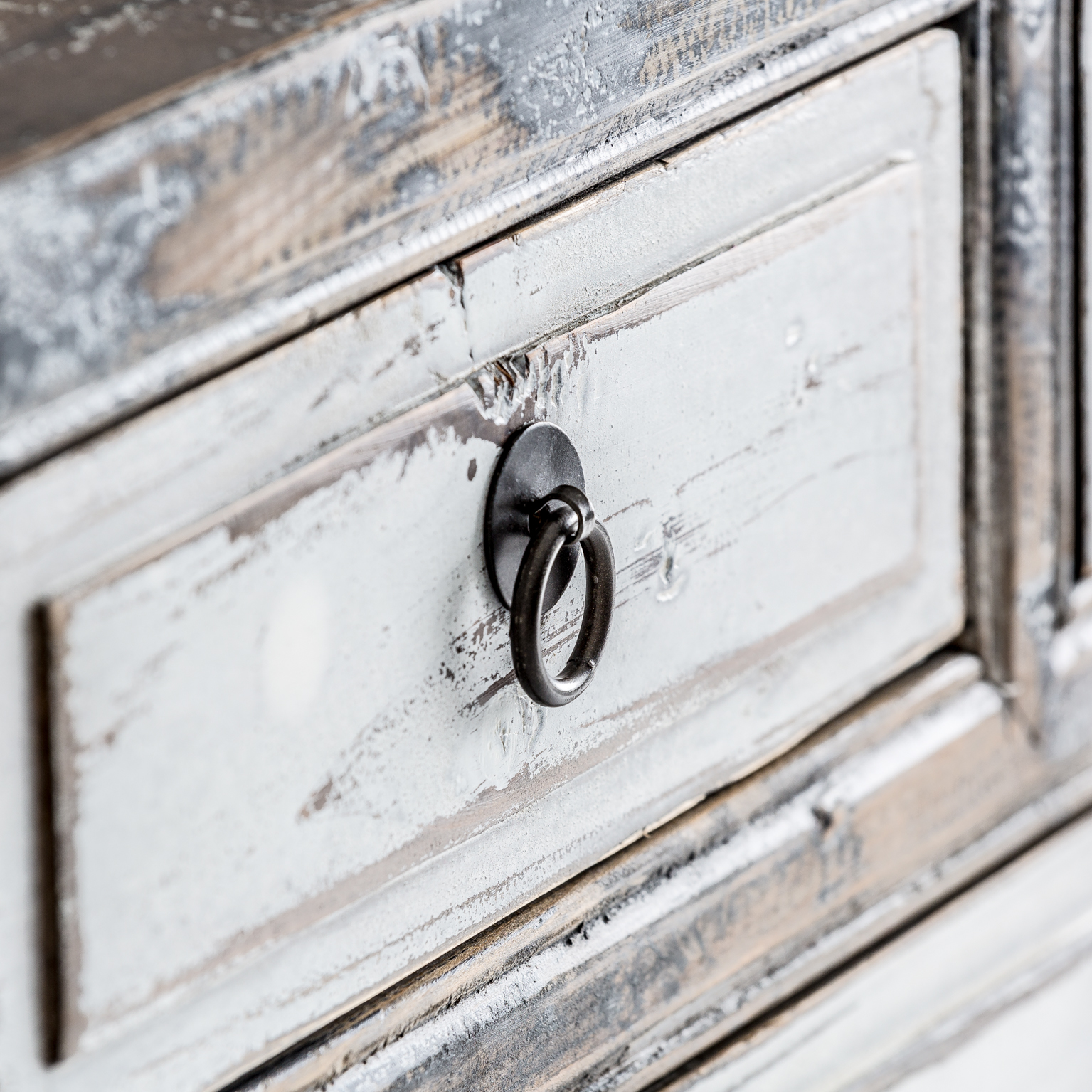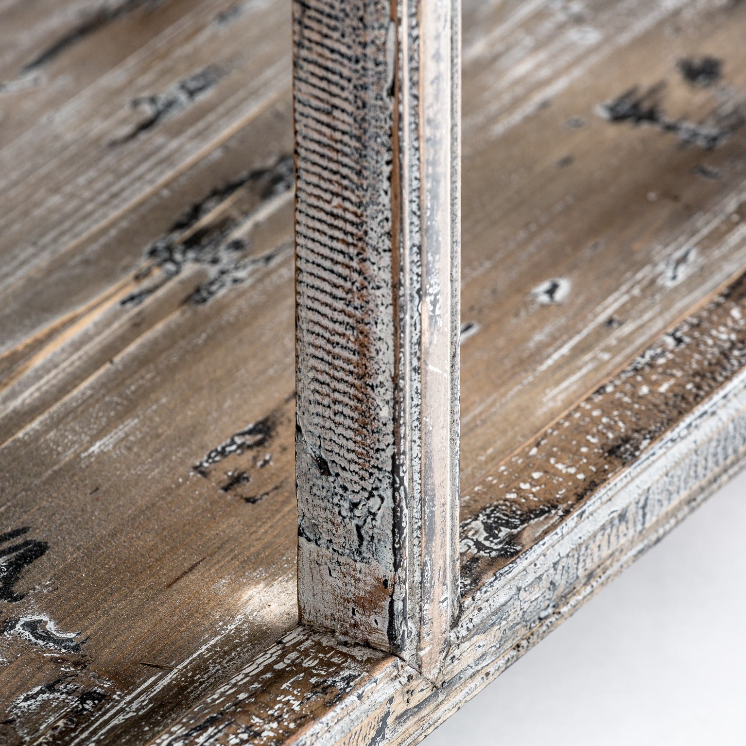 CONSOLA VIBY, EN COLOR BLANCO ROTO ENVEJECIDO, DE ESTILO ORIENTAL. FABRICADO EN MADERA DE PINO RECICLADO.