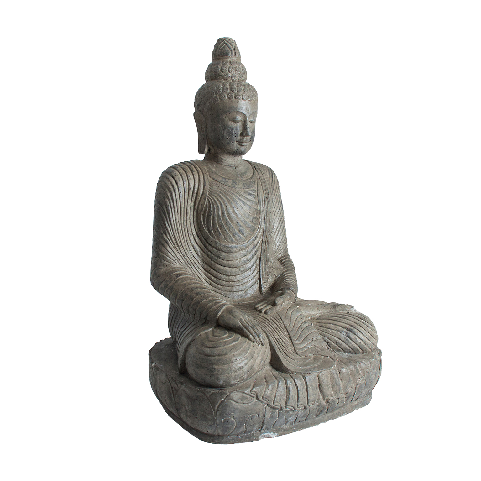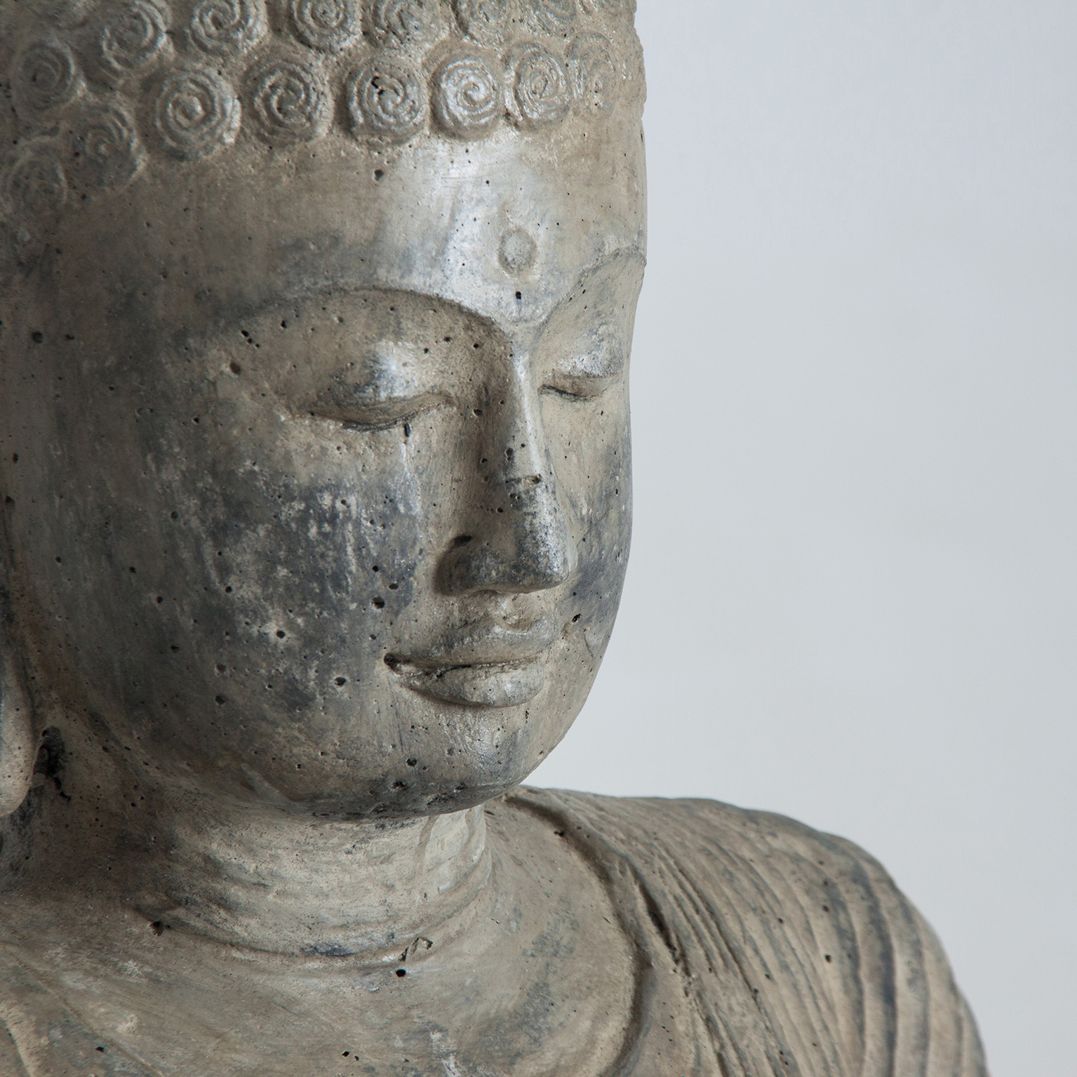 ESCULTURA BUDHA, EN COLOR GRIS ENVEJECIDO, DE ESTILO ORIENTAL. FABRICADO EN PIEDRA.