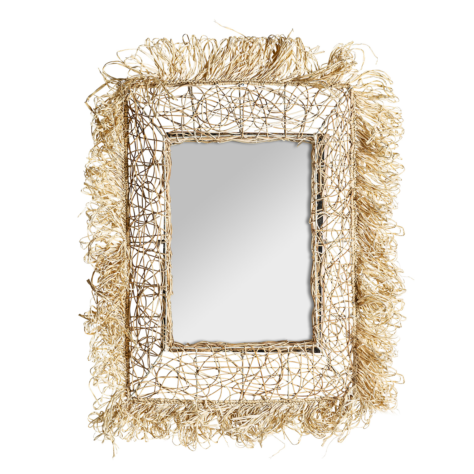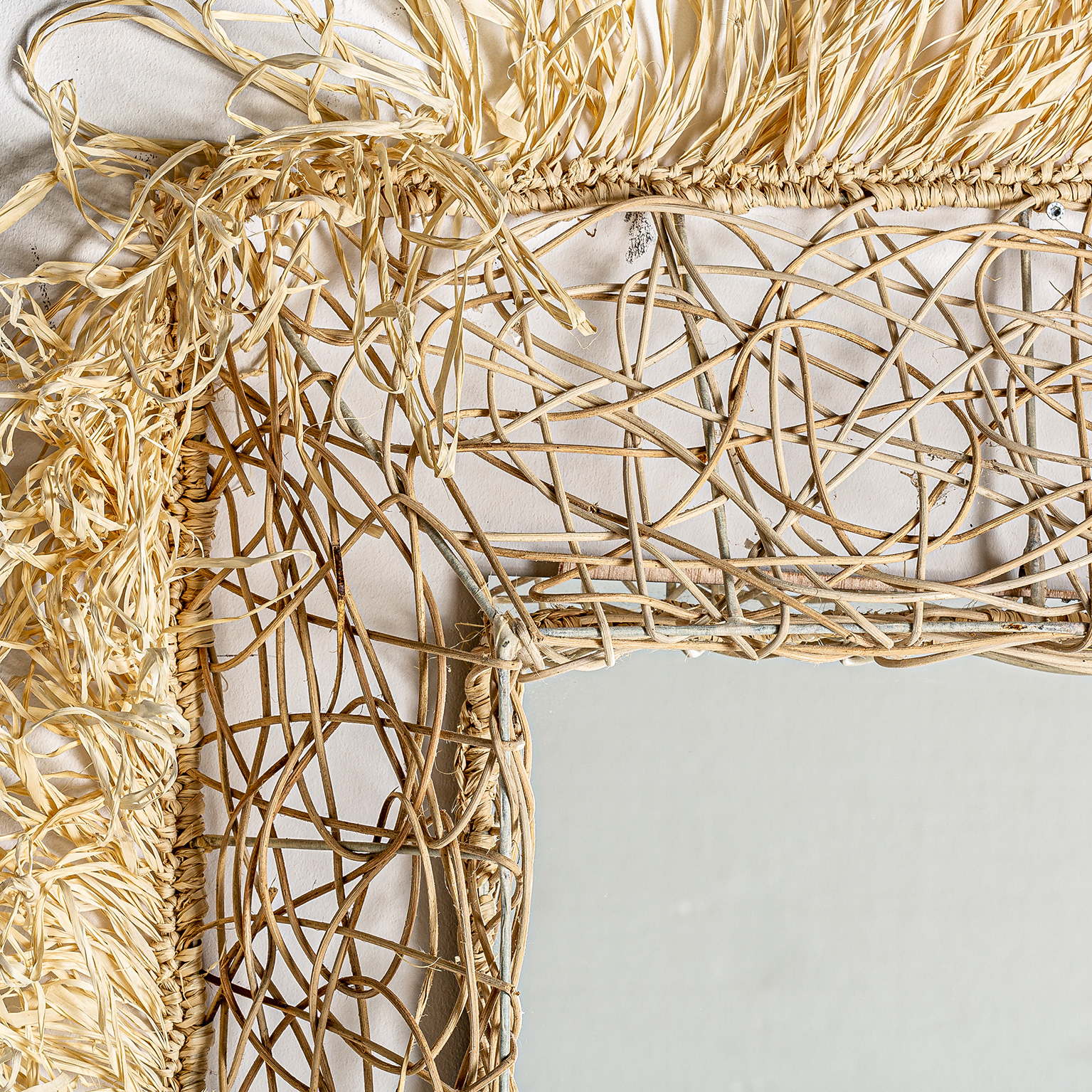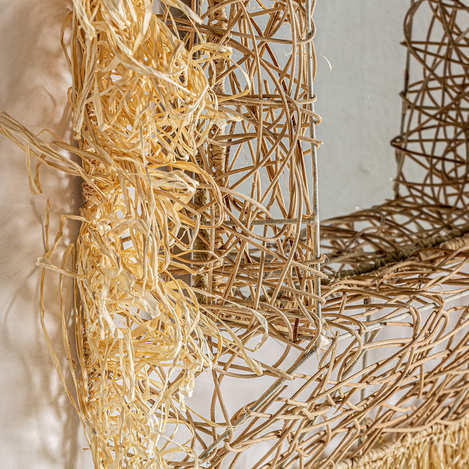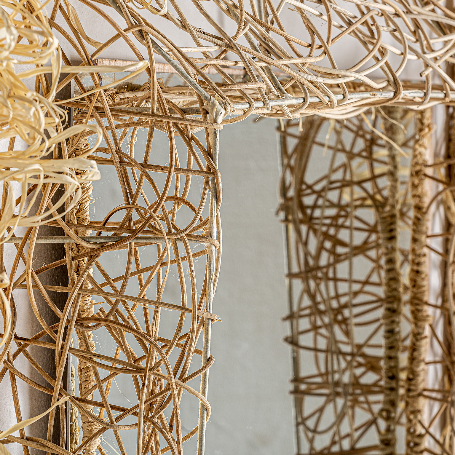 ESPEJO, EN COLOR NATURAL, DE ESTILO ÉTNICO. FABRICADO EN FIBRA NATURAL, COMBINADO CON BAMBÚ.