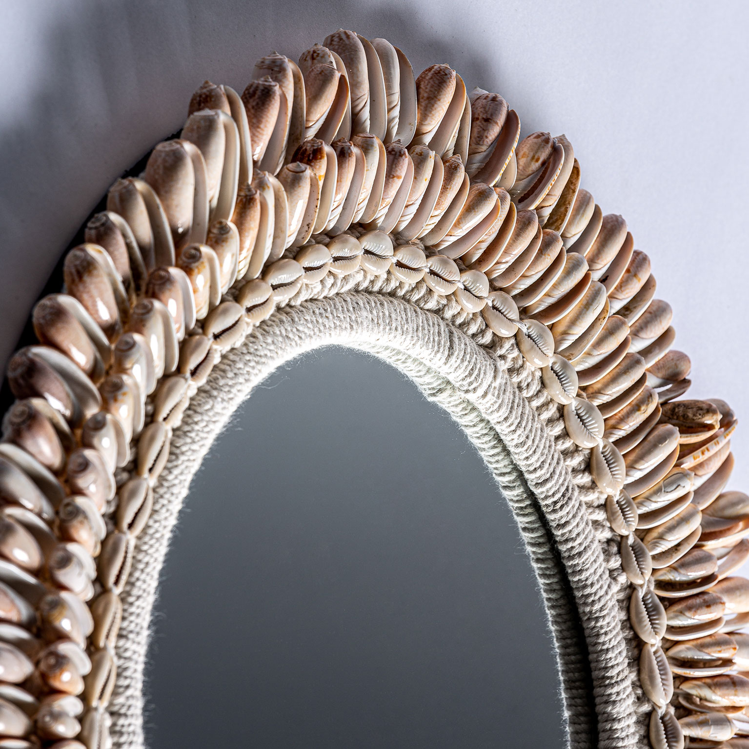 ESPEJO REDONDO DHYL, EN COLOR MARFIL, DE ESTILO ÉTNICO. FABRICADO EN CONCHA, COMBINADO CON CUERDA Y ESPEJO.