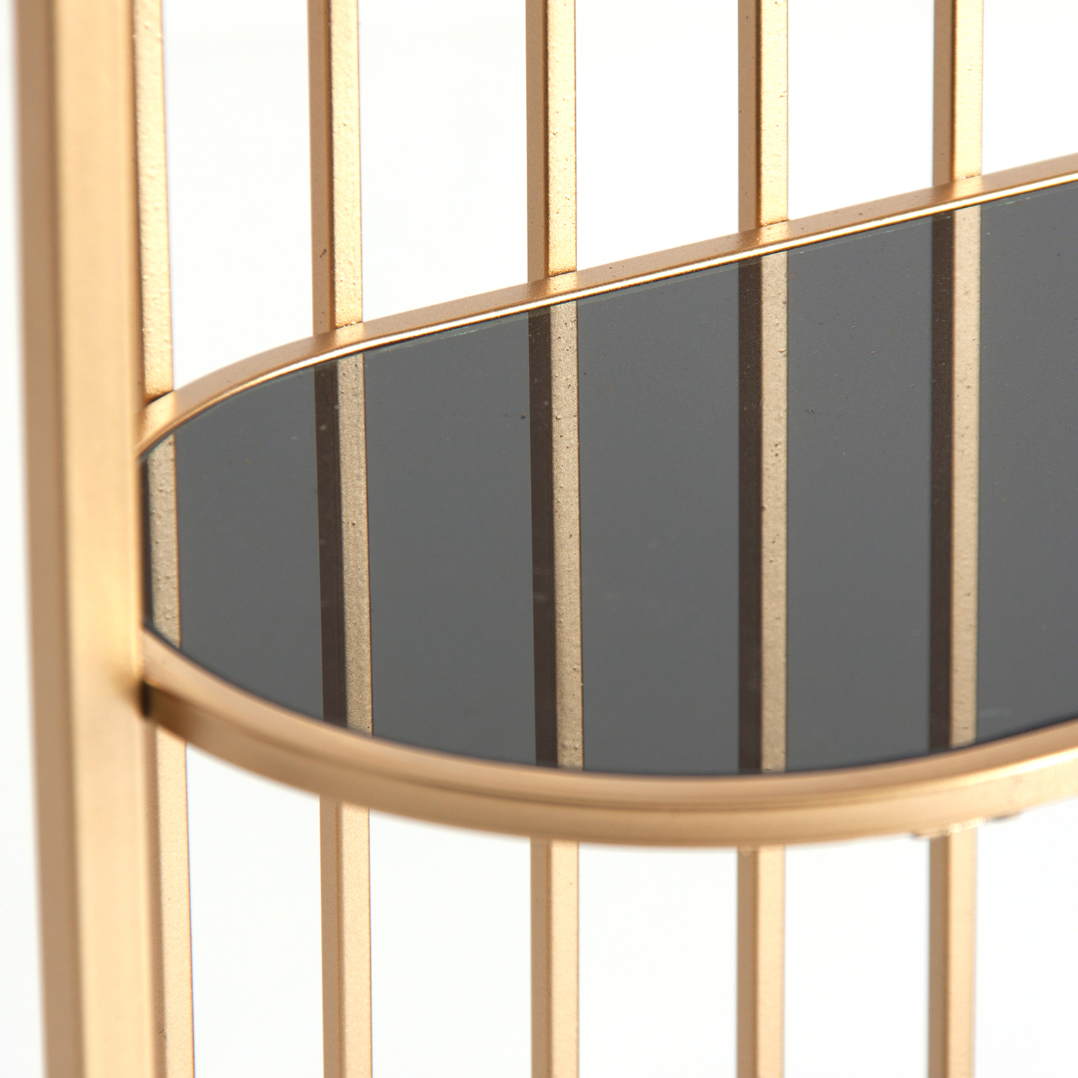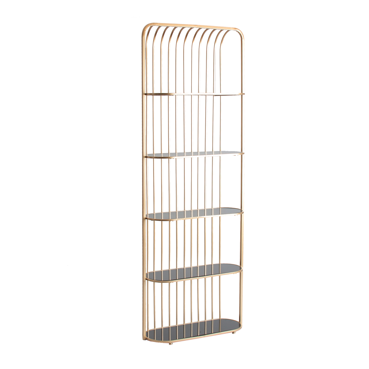 ESTANTERIA REUT, EN COLOR ORO, DE ESTILO ART DECO. FABRICADO EN HIERRO, COMBINADO CON VIDRIO.
