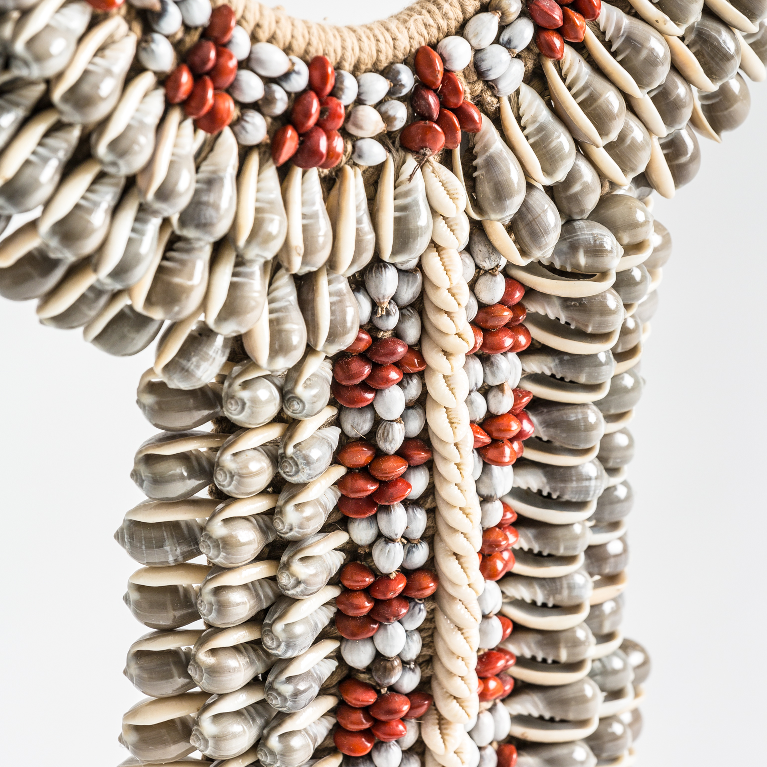 FIGURA COLLAR, EN COLOR BLANCO/ROJO, DE ESTILO ÉTNICO. FABRICADO EN HIERRO, COMBINADO CON CONCHA.