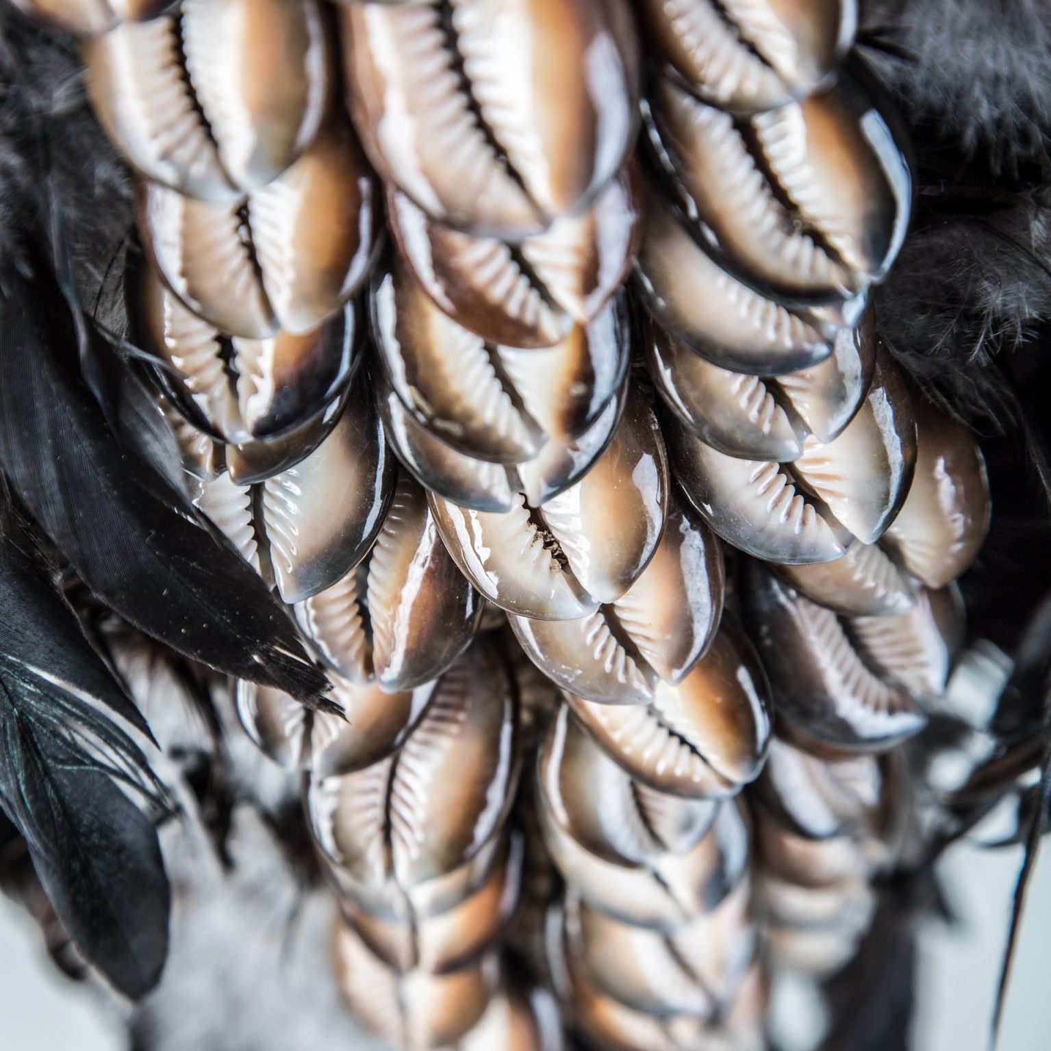 FIGURA COLLAR INGA PLUMAS, EN COLOR TONOS EN VERDE, DE ESTILO ÉTNICO. FABRICADO EN RAFIA, COMBINADO CON CONCHA Y PLUMAS. CON BASE DE HIERRO.