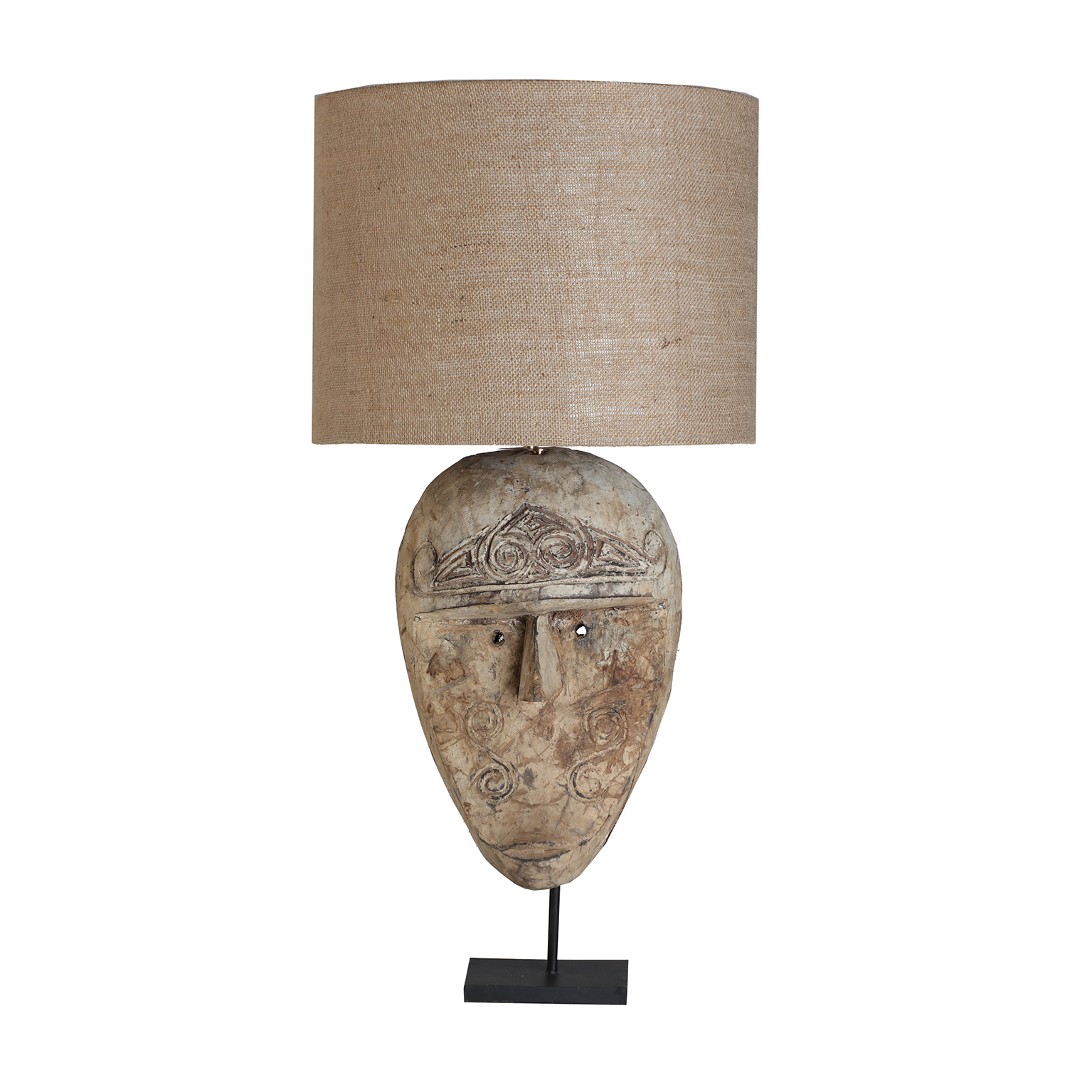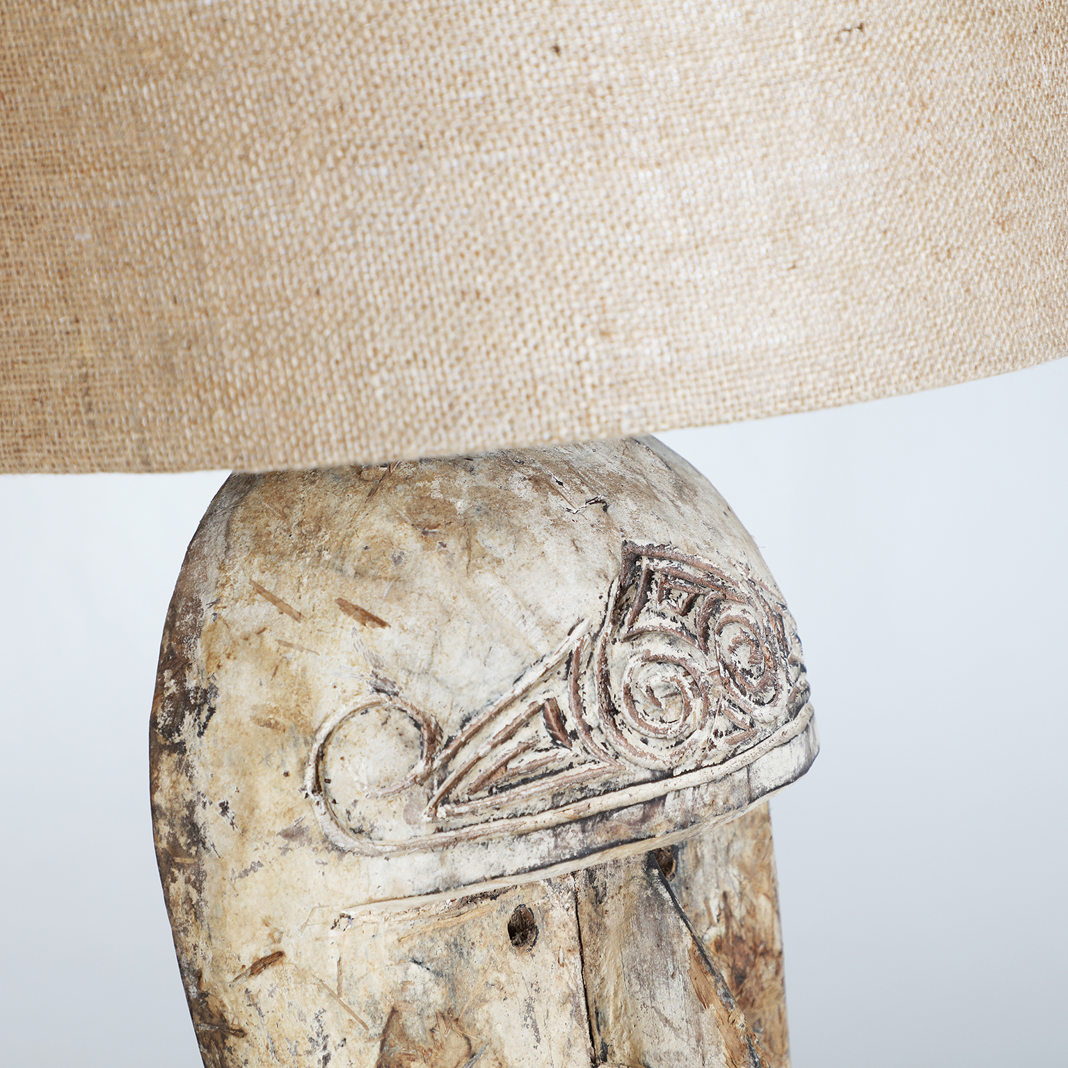LÁMPARA DE SOBREMESA, EN COLOR NATURAL ENVEJECIDO, DE ESTILO ÉTNICO. FABRICADO EN MADERA TROPICAL, COMBINADO CON YUTE.