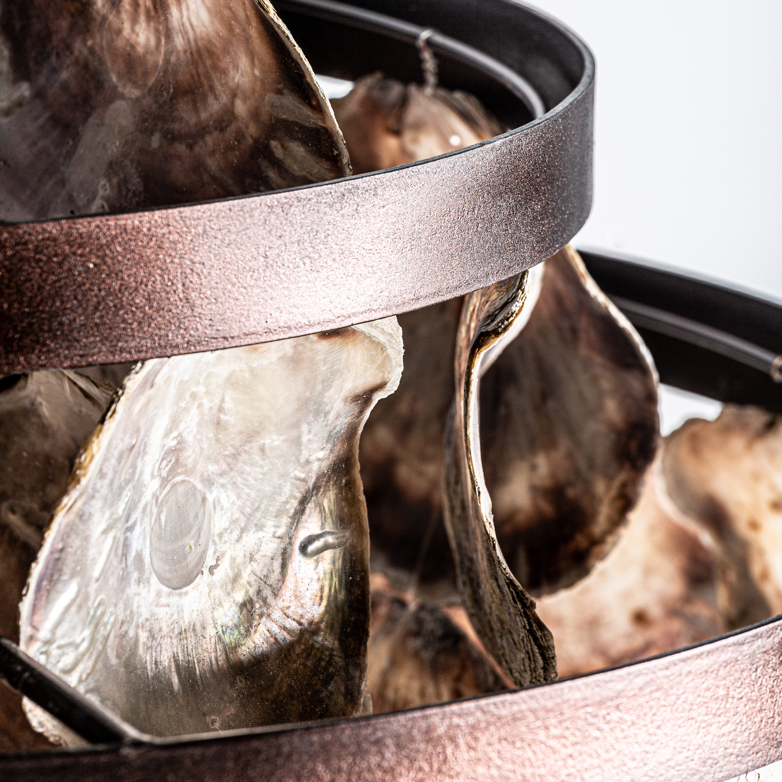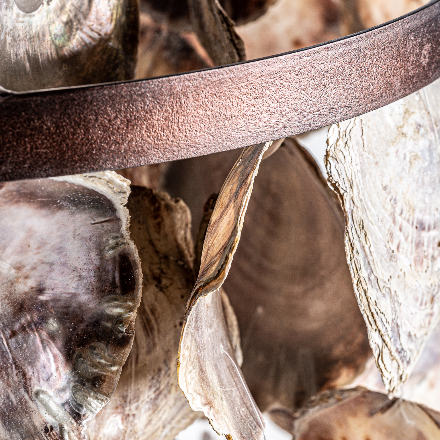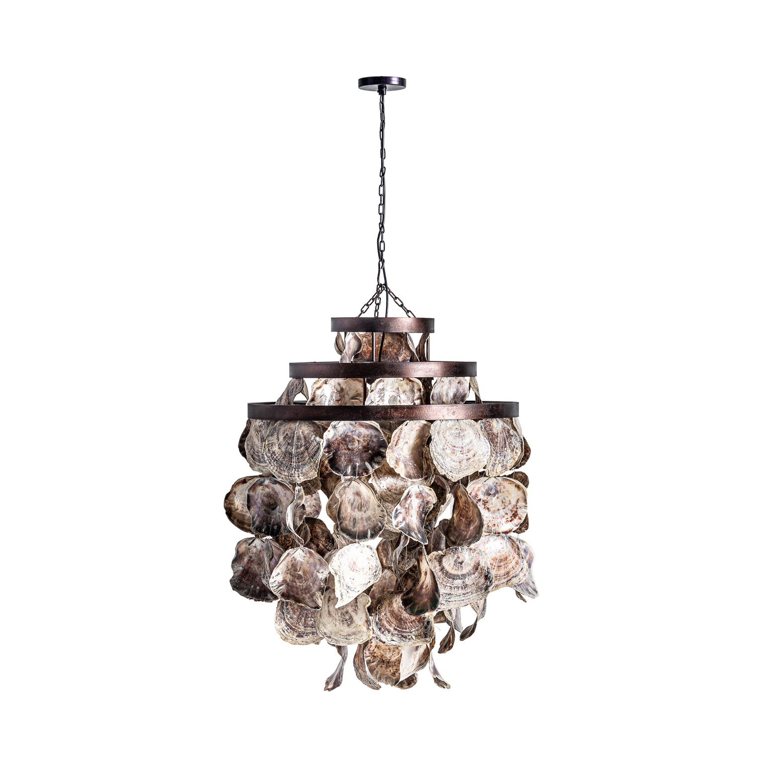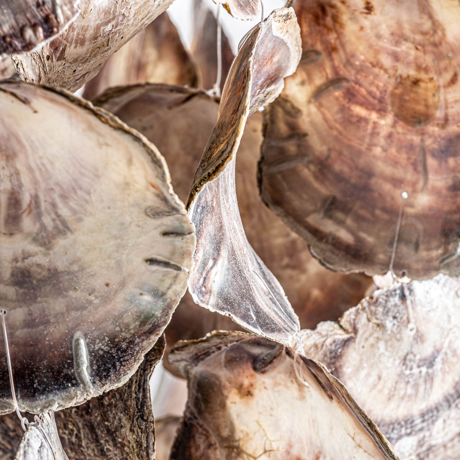 LÁMPARA DE TECHO, EN COLOR MARRÓN/BEIGE ARTESANAL, DE ESTILO CONTEMPORÁNEO. FABRICADO EN CONCHA. PRODUCTO PLEGABLE.