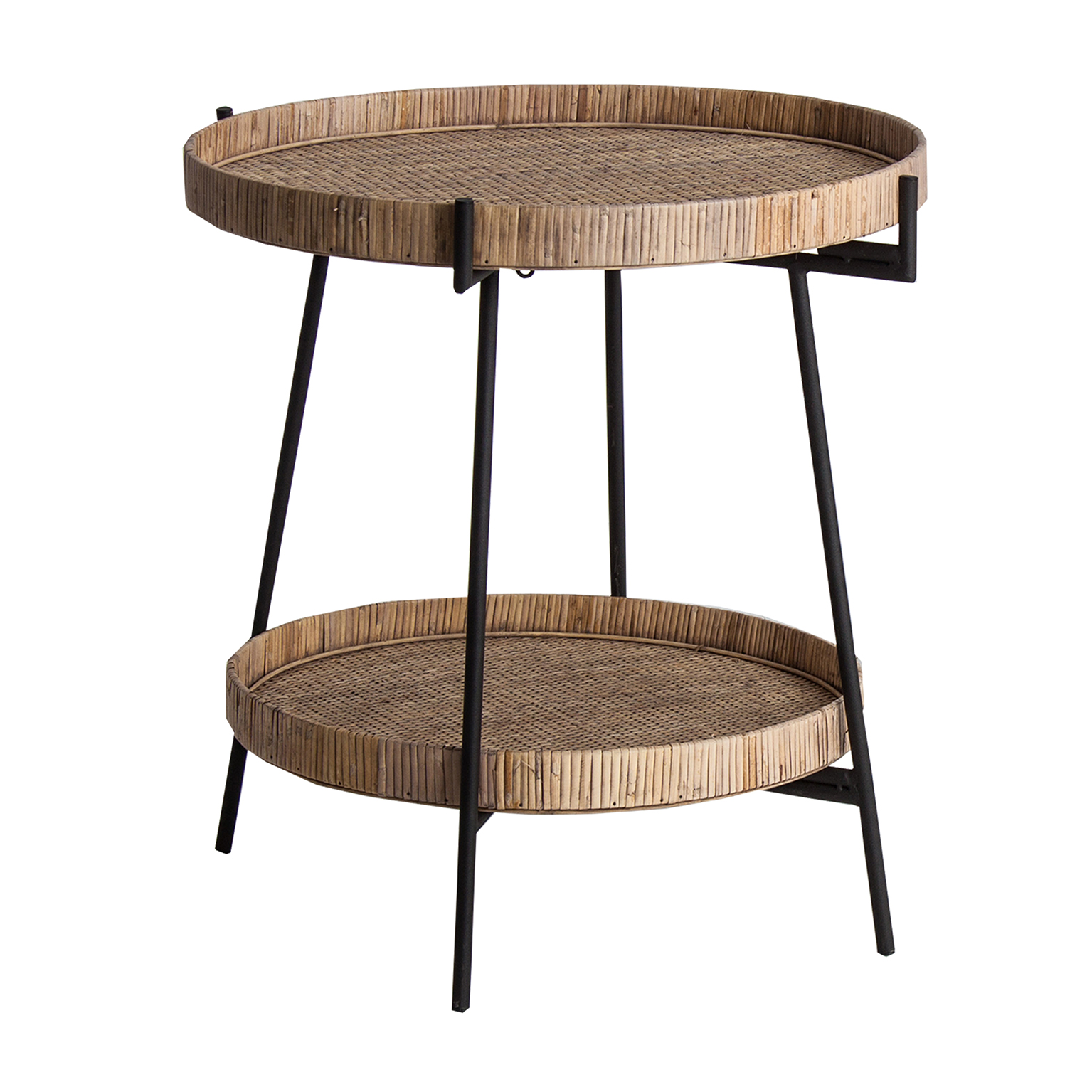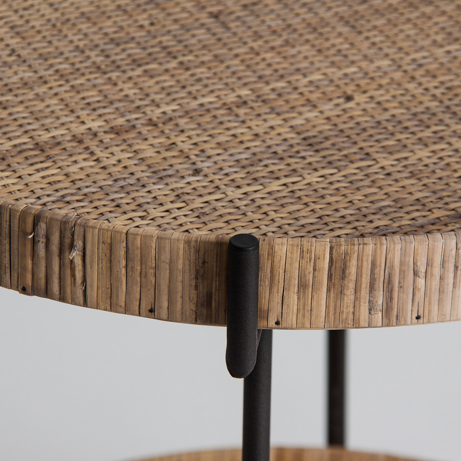 MESA AUXILIAR REDONDA GHIARE, EN COLOR NEGRO/NATURAL, DE ESTILO CONTEMPORÁNEO. FABRICADO EN HIERRO, COMBINADO CON RATÁN Y MADERA CONTRACHAPADA. PRODUCTO DESMONTABLE, PLEGABLE.