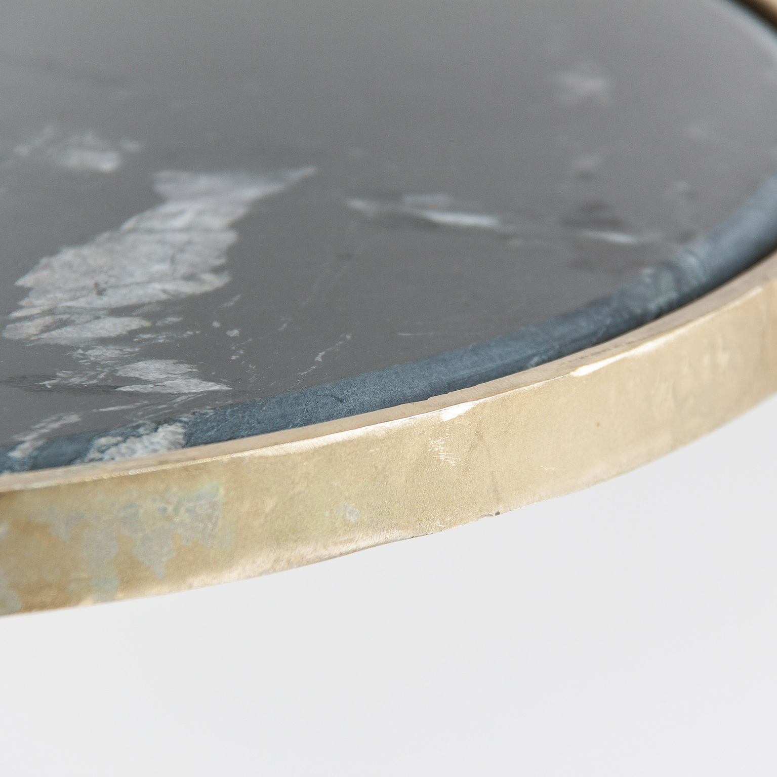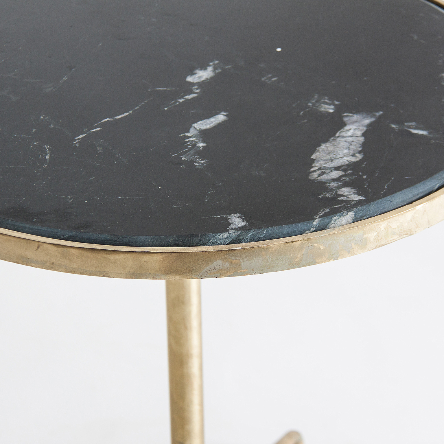 MESA AUXILIAR REDONDA HUEZ, EN COLOR NEGRO/ORO, DE ESTILO ART DECO. FABRICADO EN HIERRO, COMBINADO CON MÁRMOL. PRODUCTO DESMONTABLE.