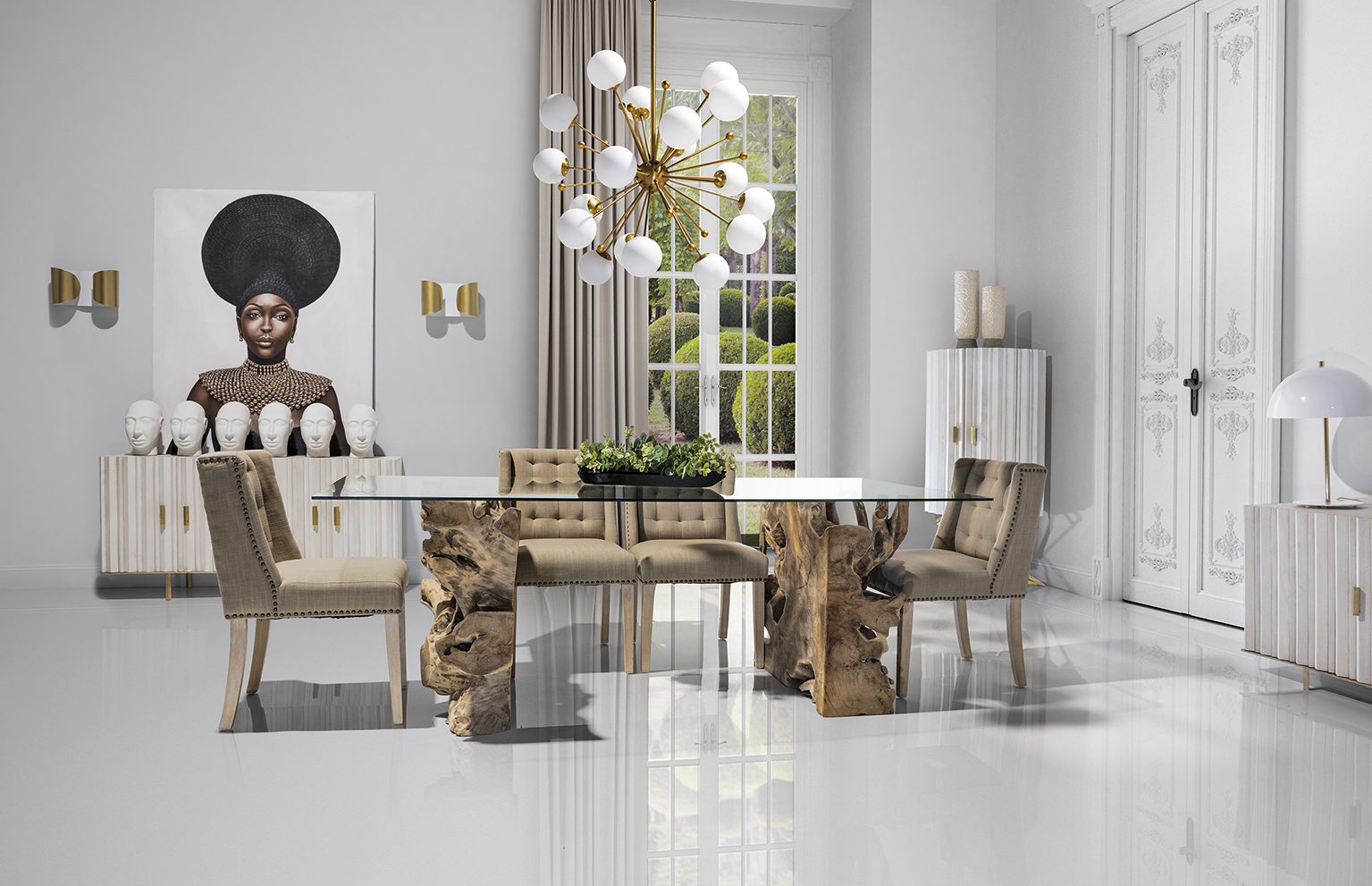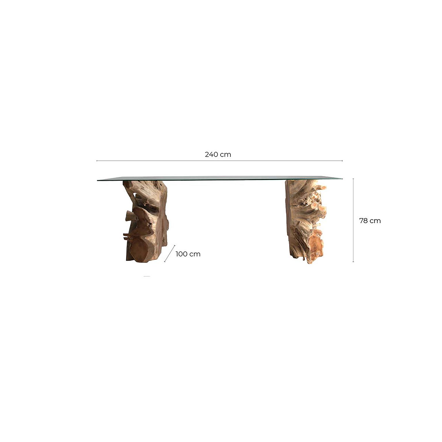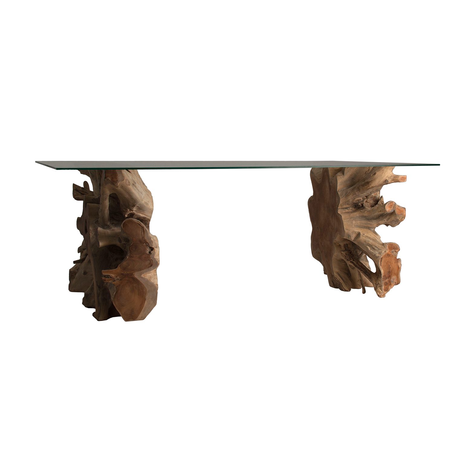 MESA COMEDOR WREN, EN COLOR NATURAL ENVEJECIDO, DE ESTILO ÉTNICO. FABRICADO EN RAÍZ TEKA, COMBINADO CON VIDRIO. INCLUYE CRISTAL. PRODUCTO DESMONTABLE.