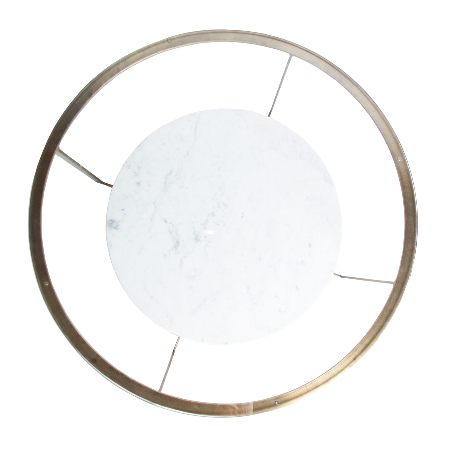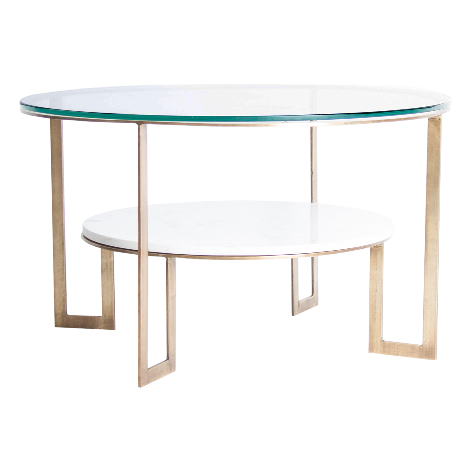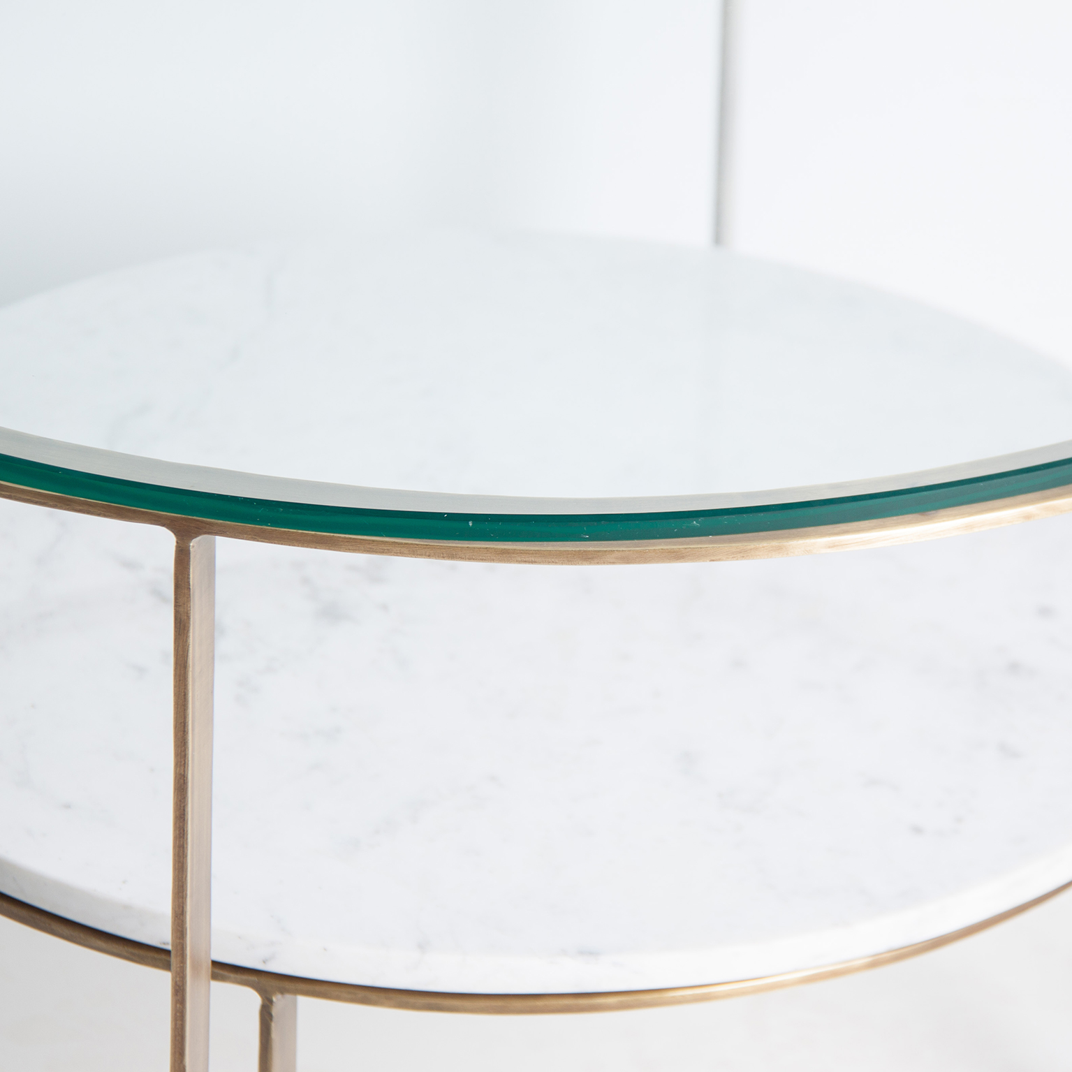 MESA DE CENTRO REDONDA CHELM, EN COLOR BLANCO/ORO, DE ESTILO ART DECO. FABRICADO EN HIERRO, COMBINADO CON CRISTAL Y MÁRMOL. PRODUCTO DESMONTABLE.
