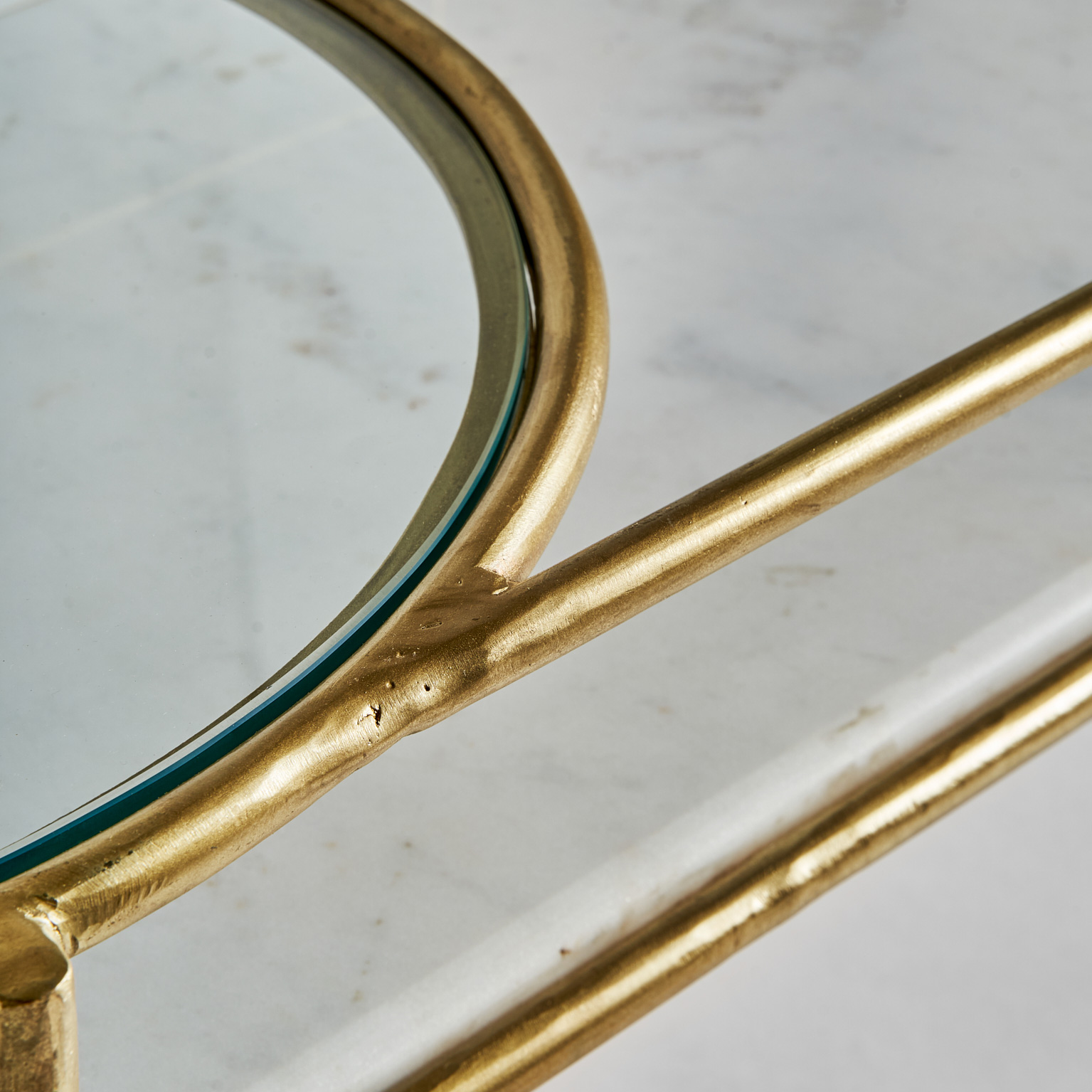 MESA DE CENTRO DIEUZE, EN COLOR ORO, DE ESTILO ART DECO. FABRICADO EN HIERRO, COMBINADO CON MÁRMOL. PRODUCTO DESMONTABLE.