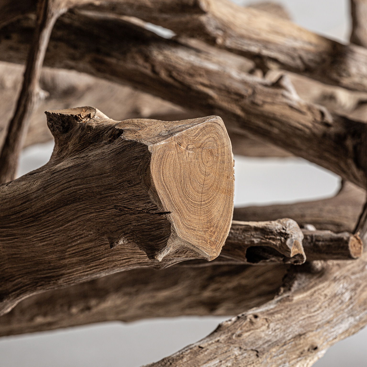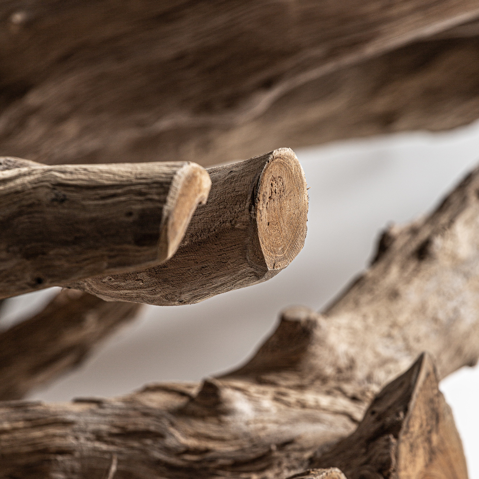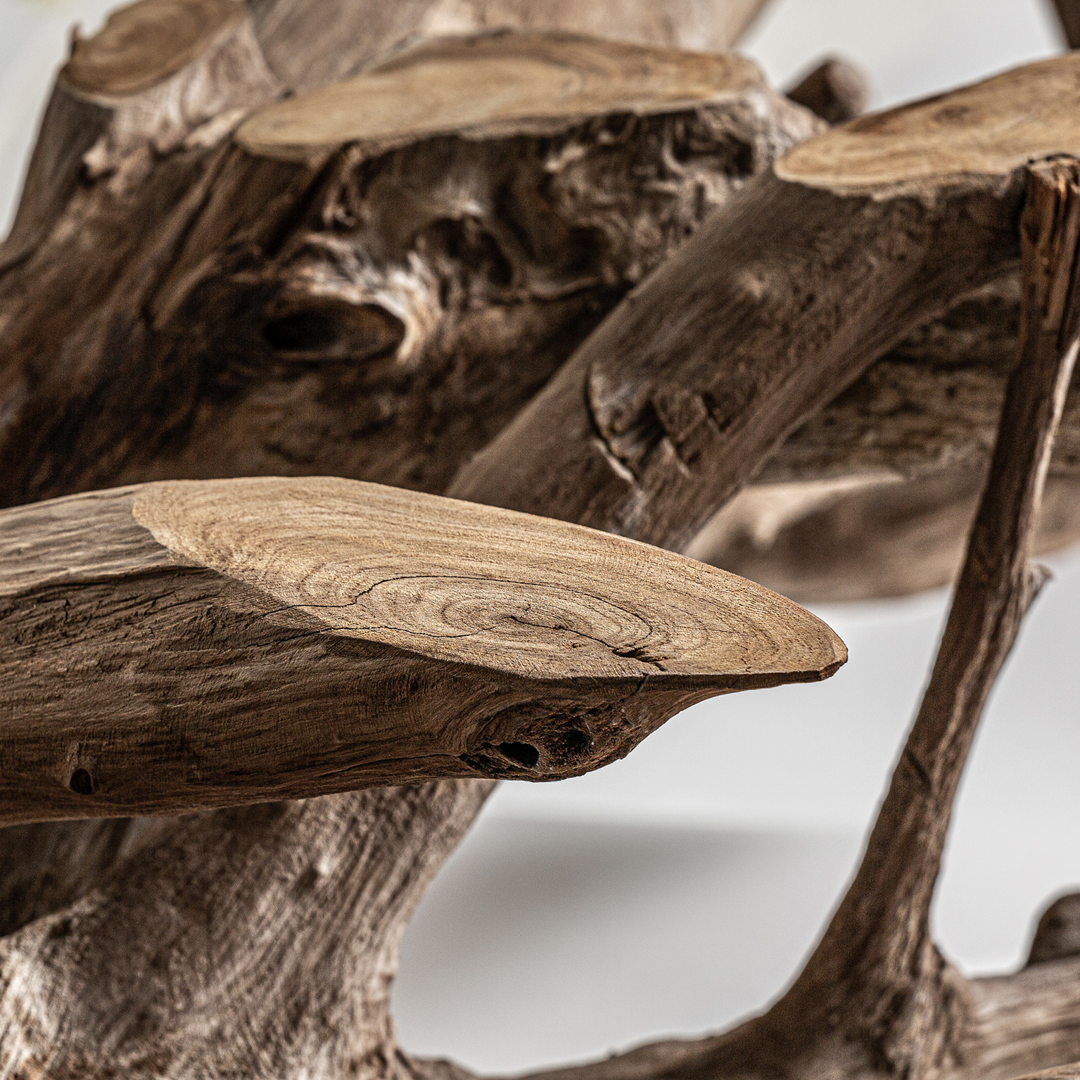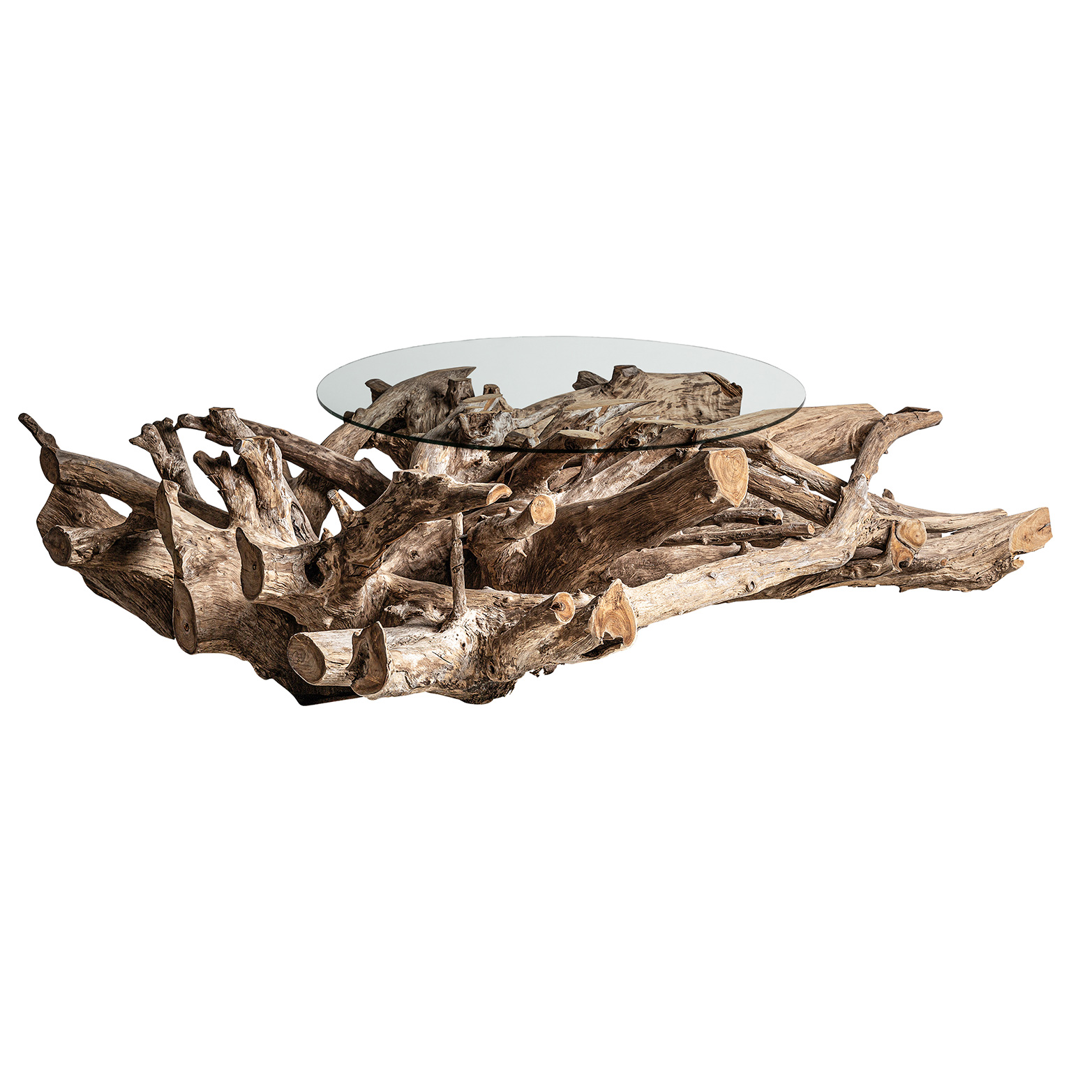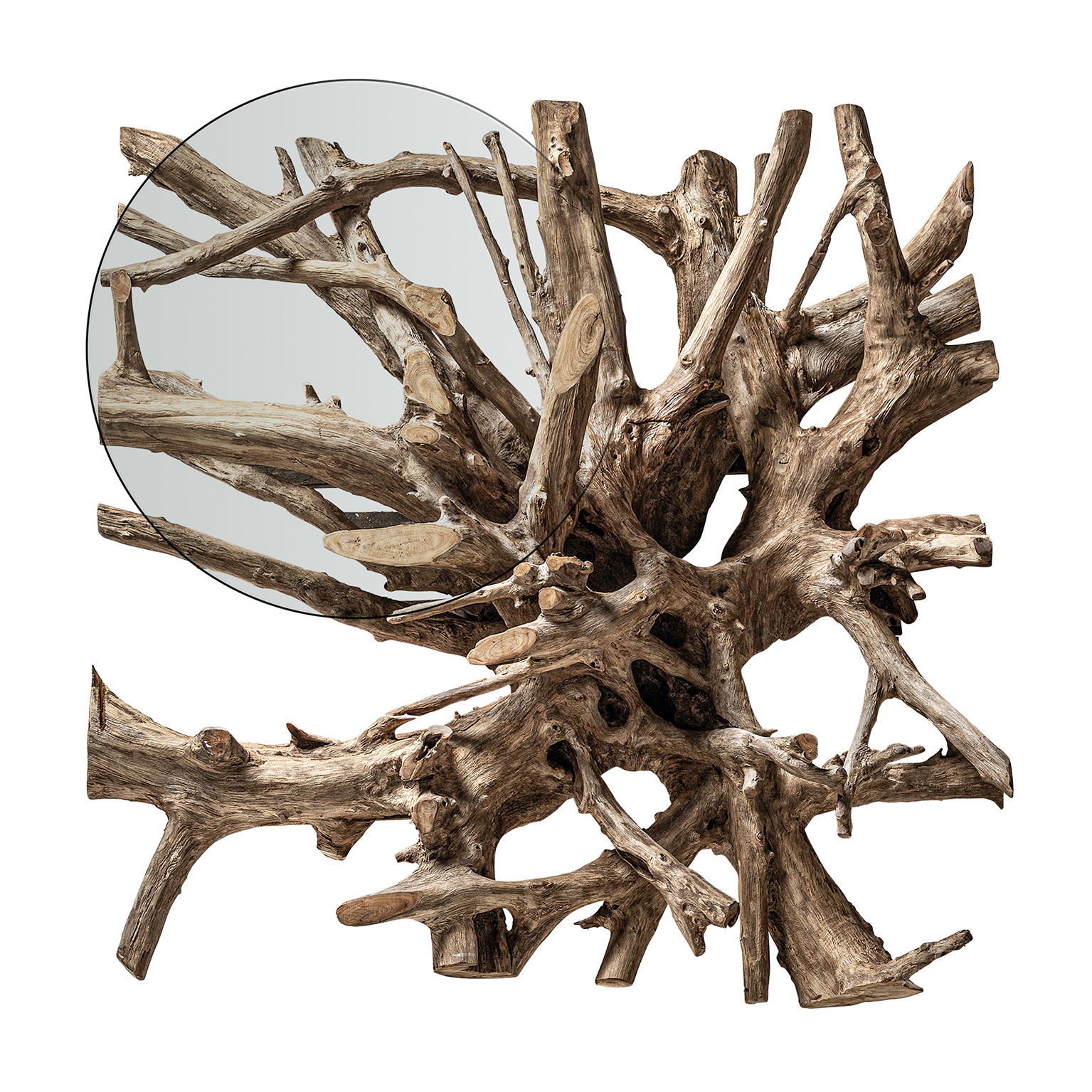 MESA DE CENTRO IKARIA, EN COLOR NATURAL ENVEJECIDO, DE ESTILO ÉTNICO. FABRICADO EN RAÍZ TEKA, COMBINADO CON CRISTAL. PUEDE VARIAR DE COLOR FORMA Y TAMAÑO YA QUE SE TRATA DE UNA PIEZA ARTESANAL.