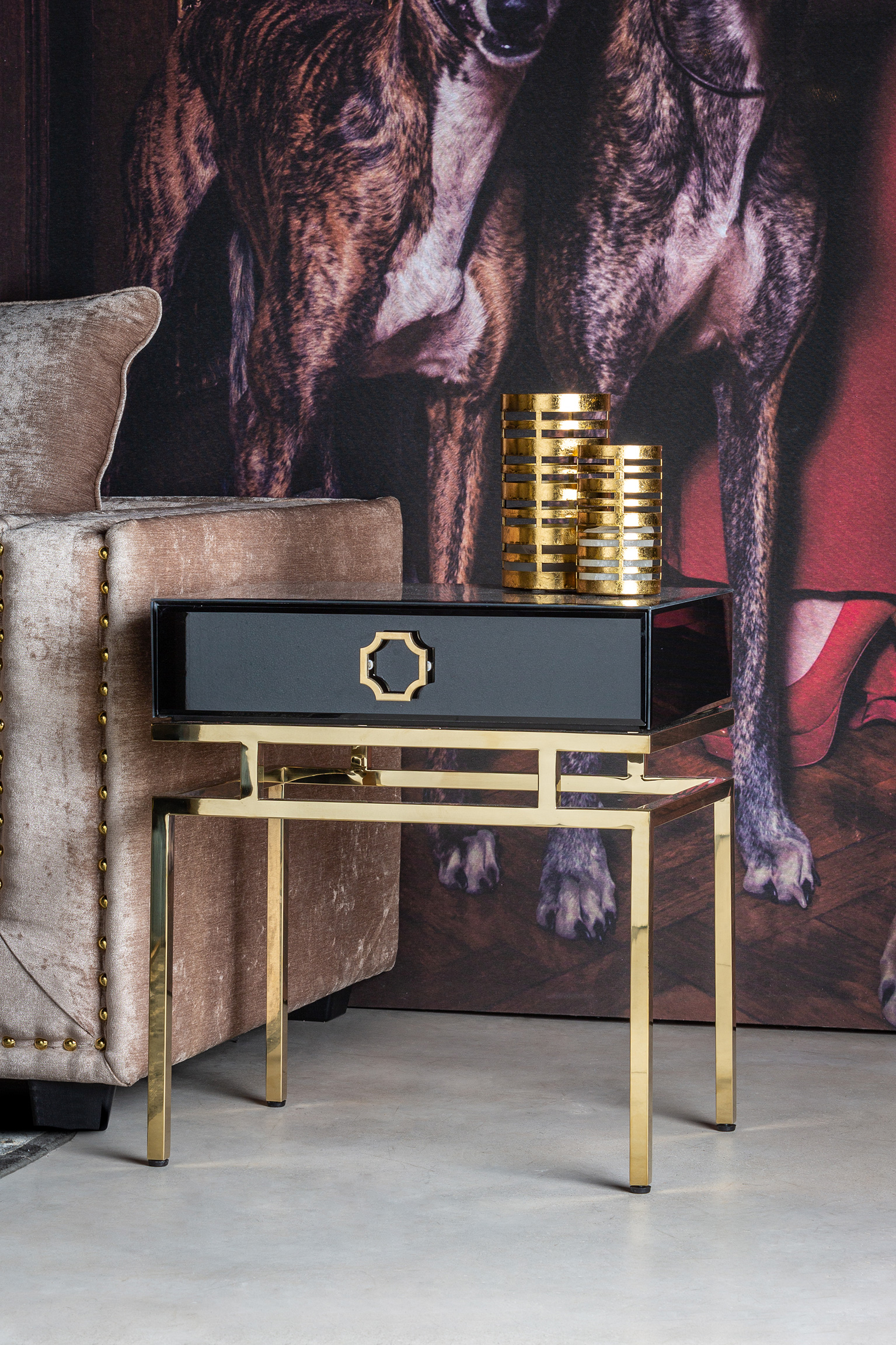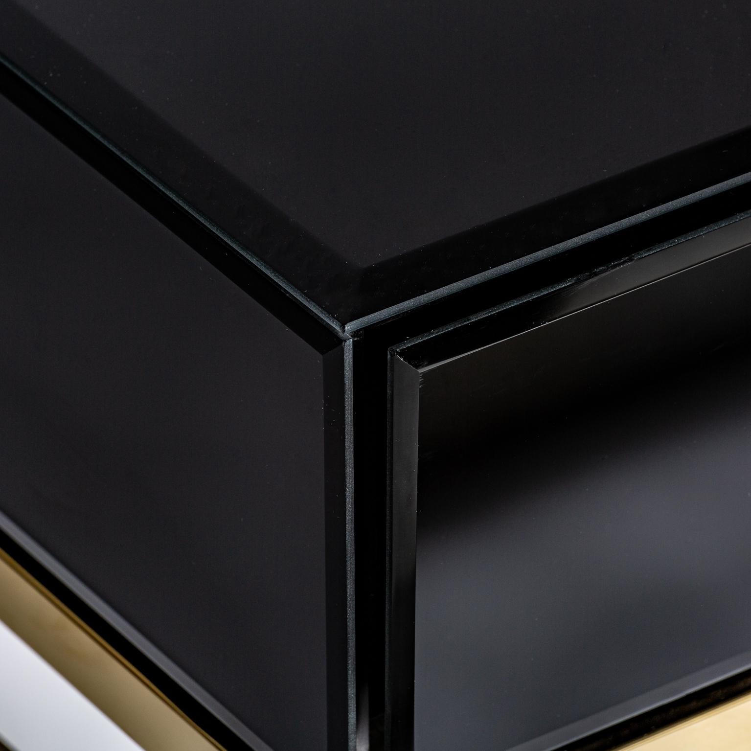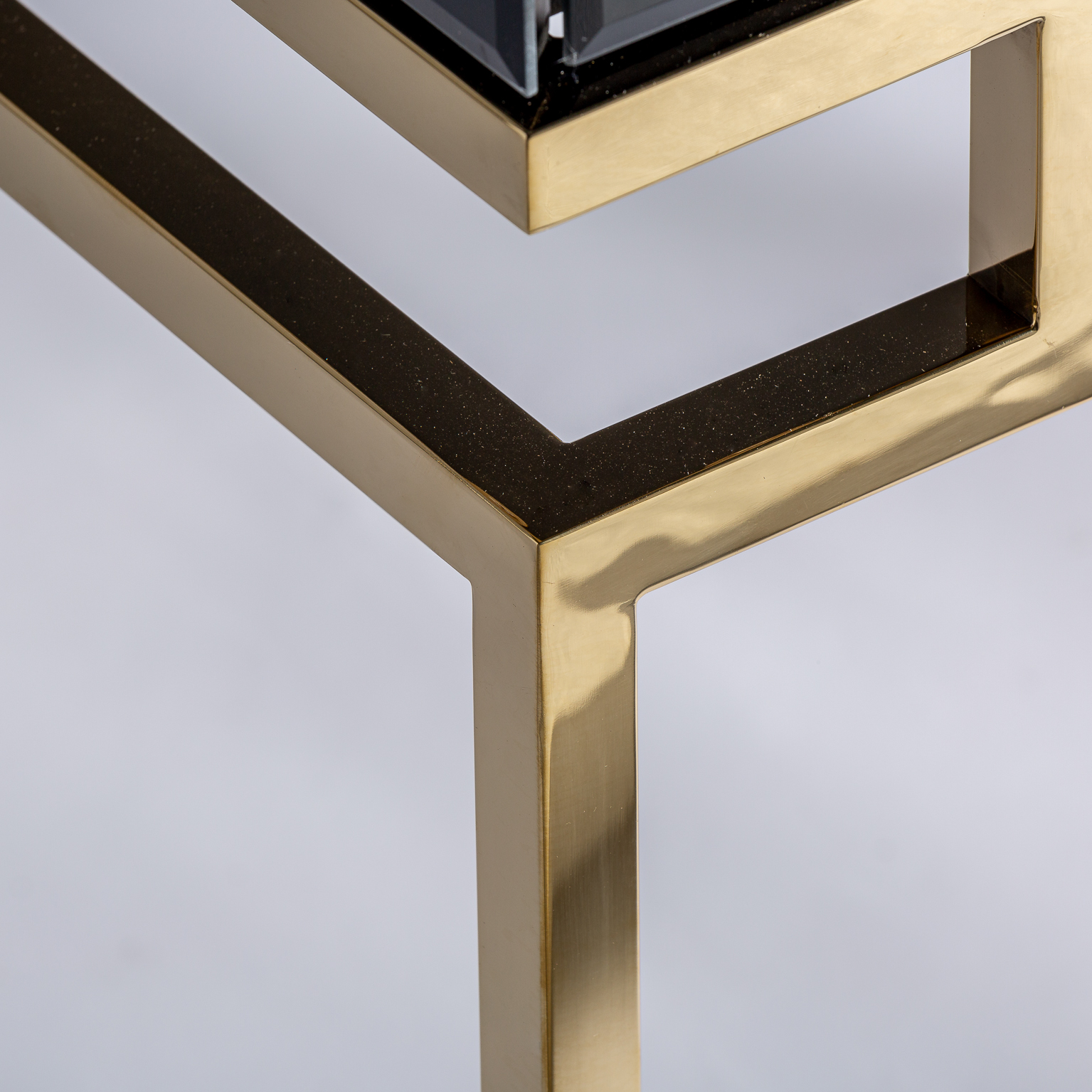 MESITA RECTANGULAR HOPFING, EN COLOR NEGRO/ORO BRILLO, DE ESTILO ART DECO. FABRICADO EN ACERO, COMBINADO CON CRISTAL.