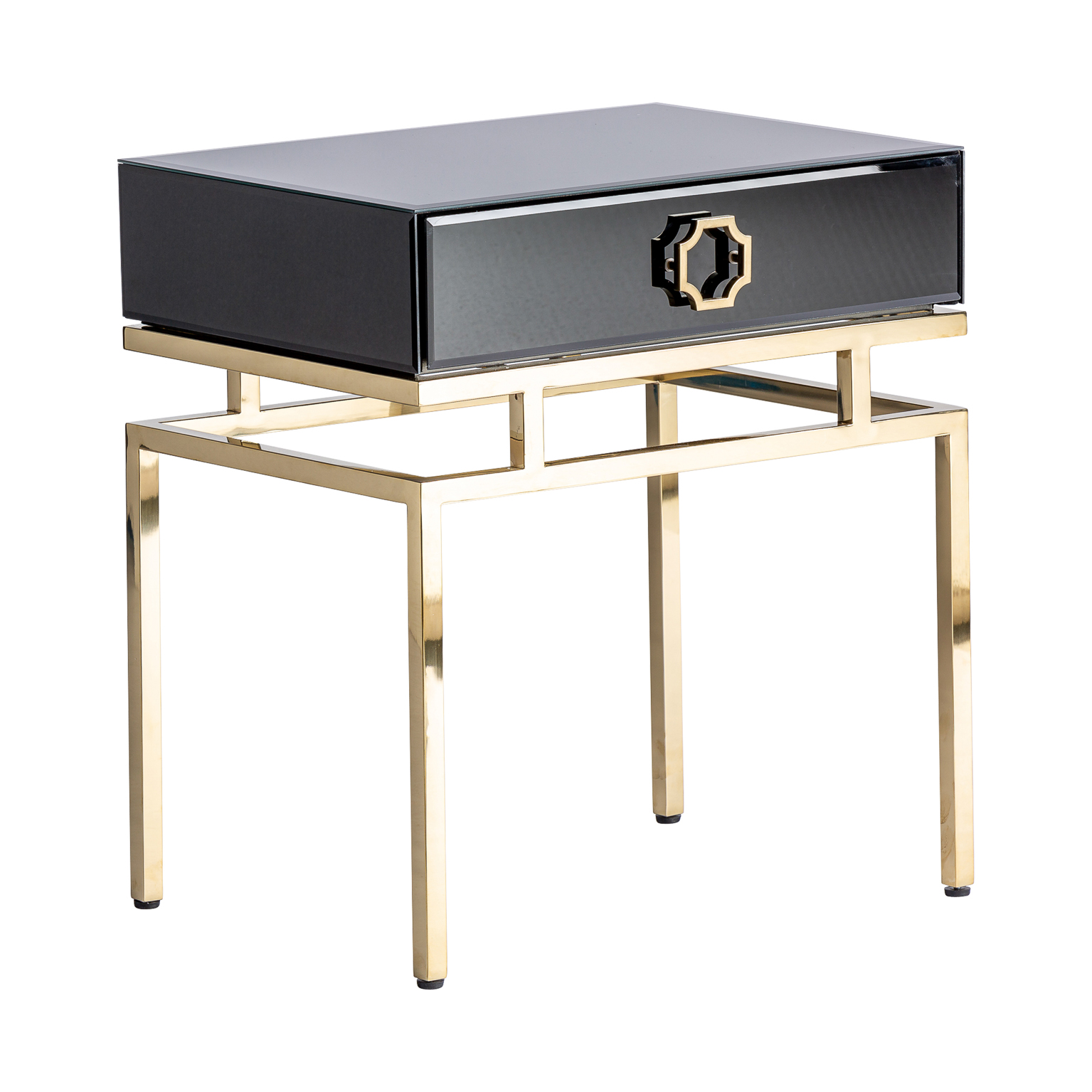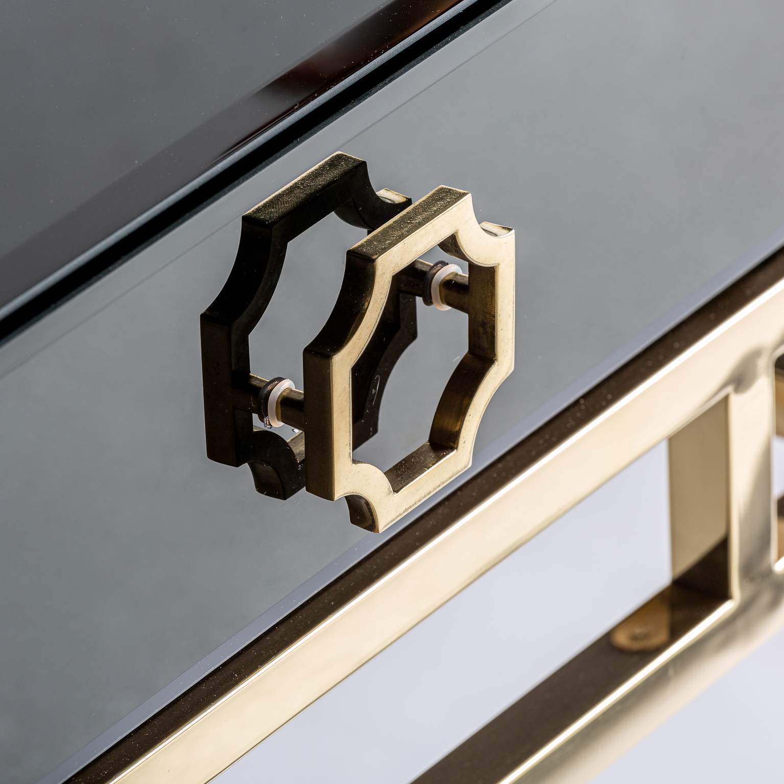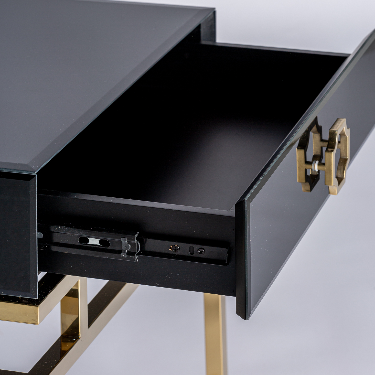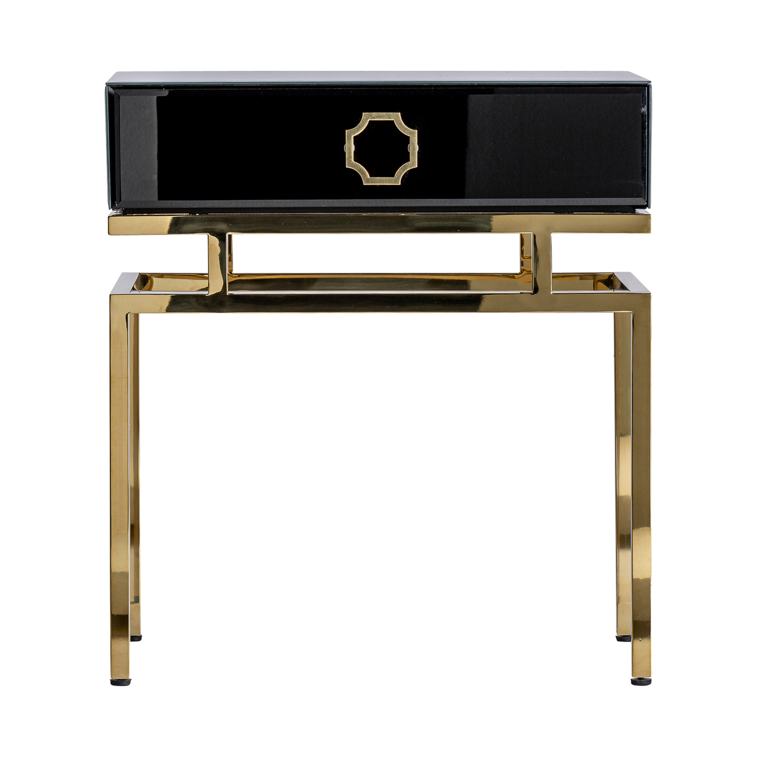MESITA RECTANGULAR HOPFING, EN COLOR NEGRO/ORO BRILLO, DE ESTILO ART DECO. FABRICADO EN ACERO, COMBINADO CON CRISTAL.