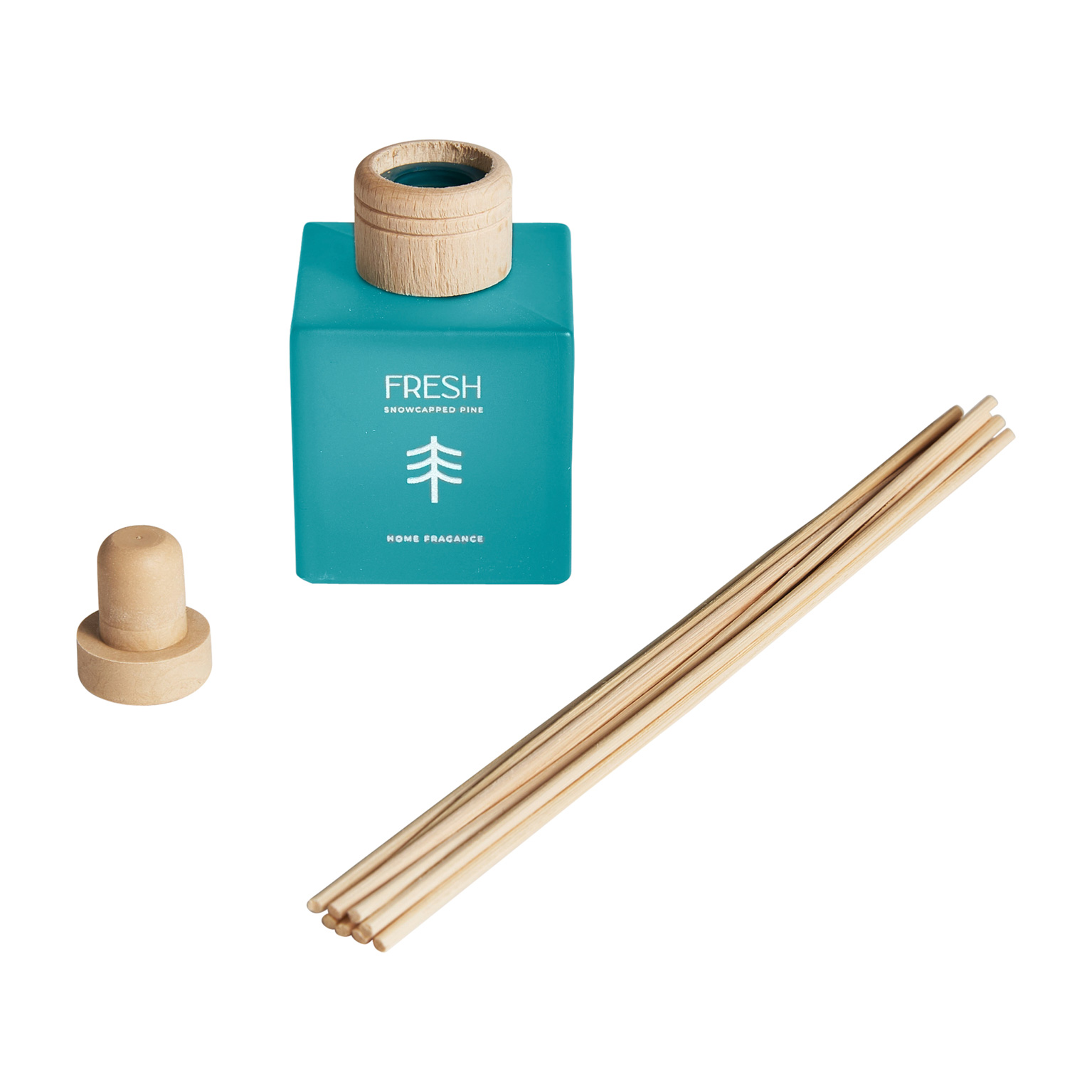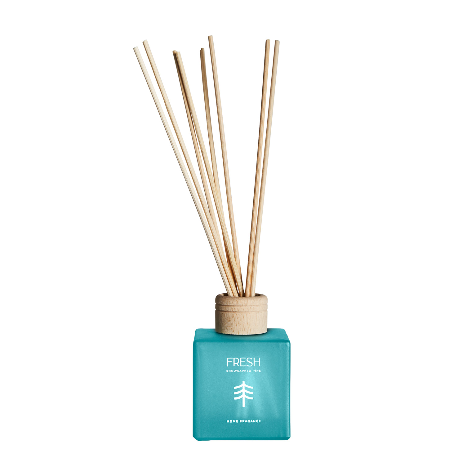 MIKADO FRESH, EN COLOR AZUL, DE ESTILO SHABBY CHIC. FABRICADO EN VIDRIO, COMBINADO CON MADERA DE HAYA Y RATÁN. 75% ALCOHOL LOCIÓN YBK, A 96º – 25% FRESCO DE PINO NEVADO. 100 ML.
