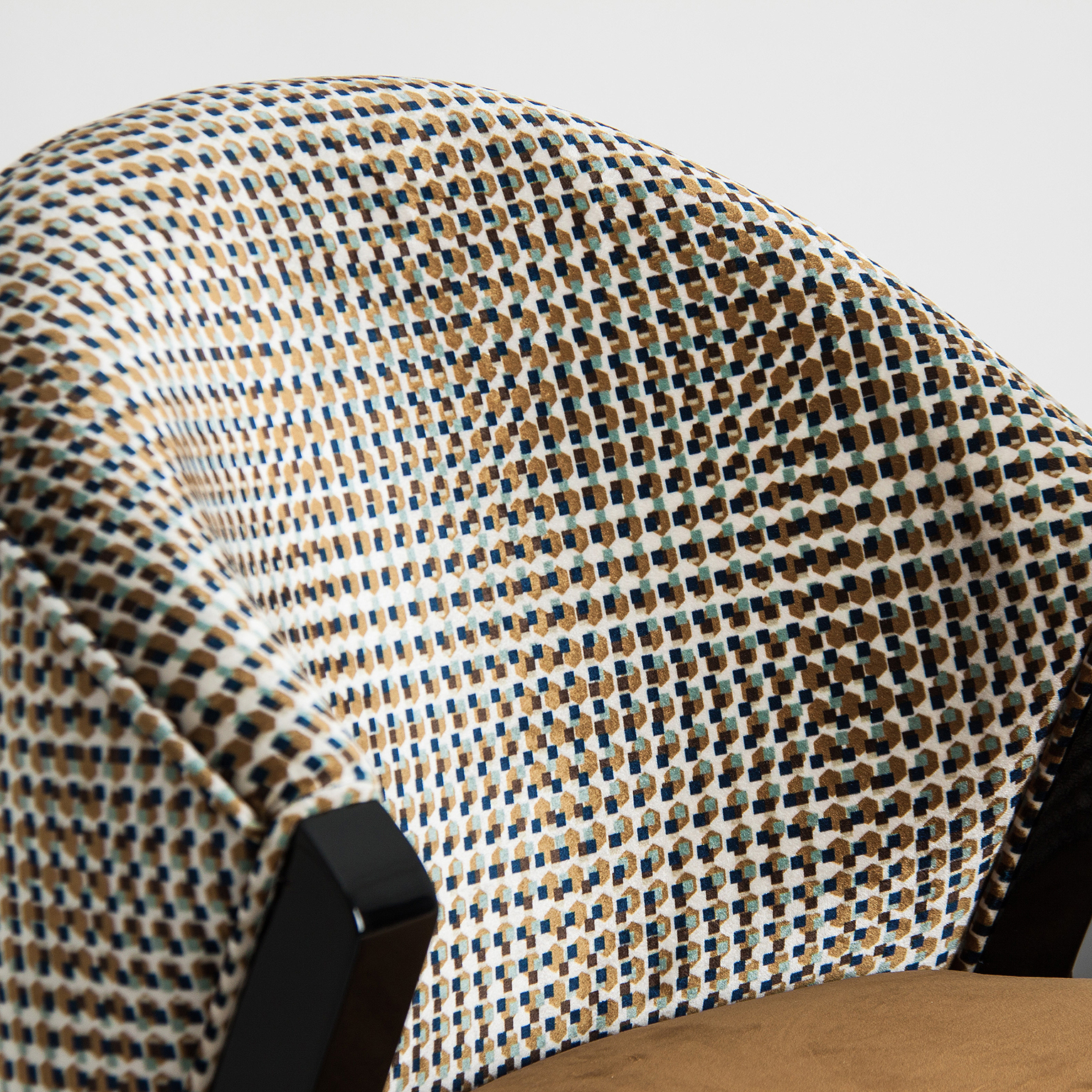 SILLA BRILLON, EN COLOR OCRE, DE ESTILO CONTEMPORÁNEO. FABRICADO EN TERCIOPELO, COMBINADO CON ESPUMA Y MADERA DE CAUCHO.