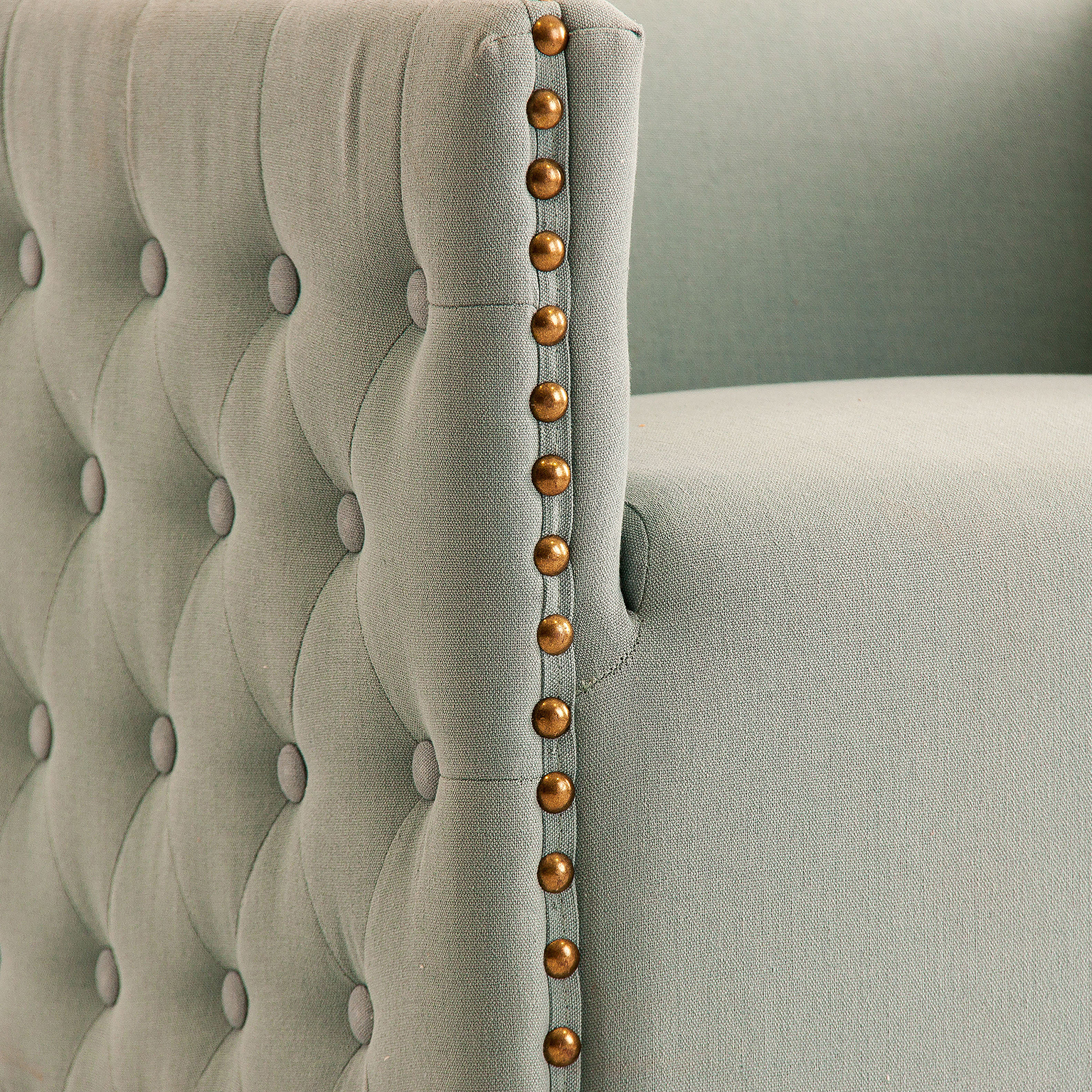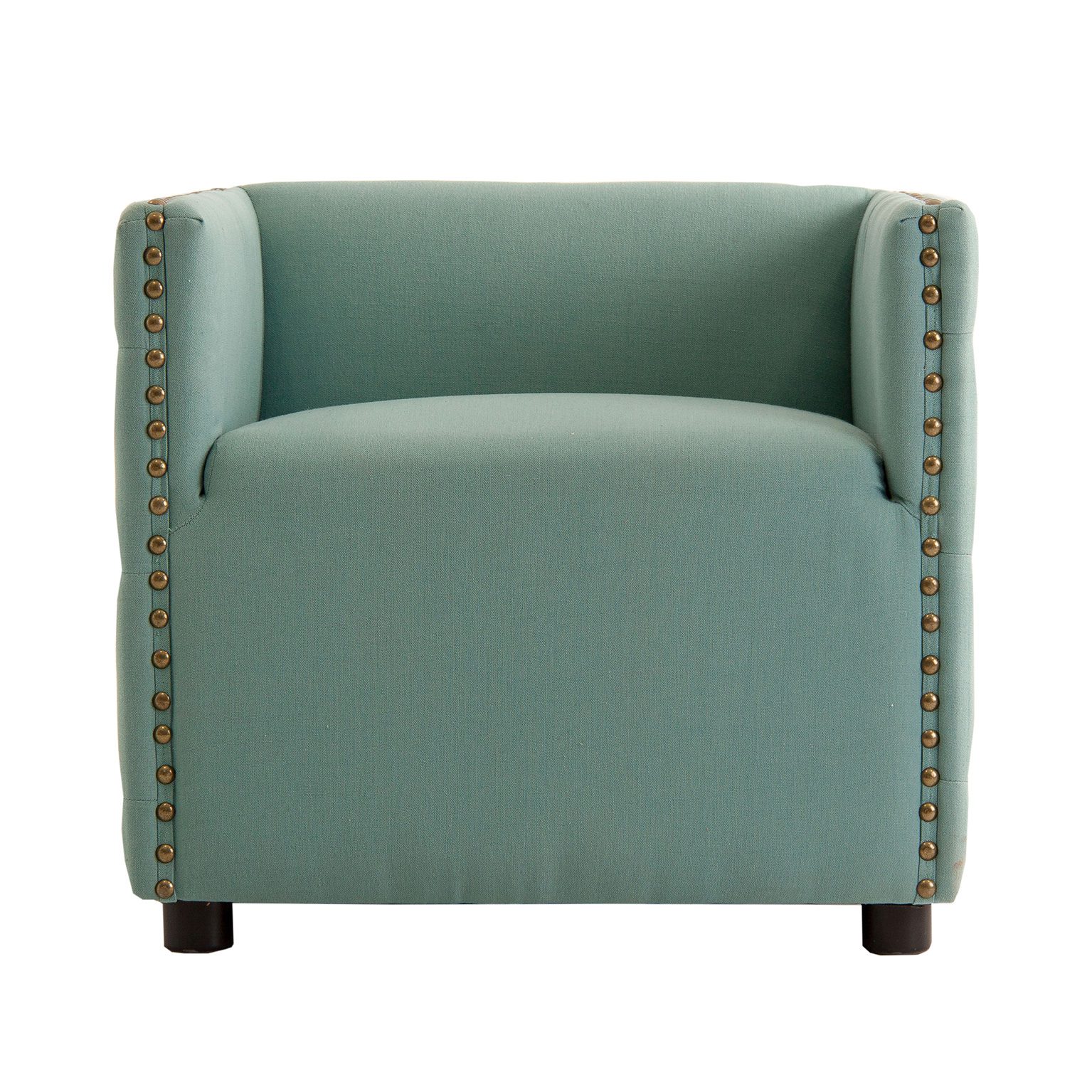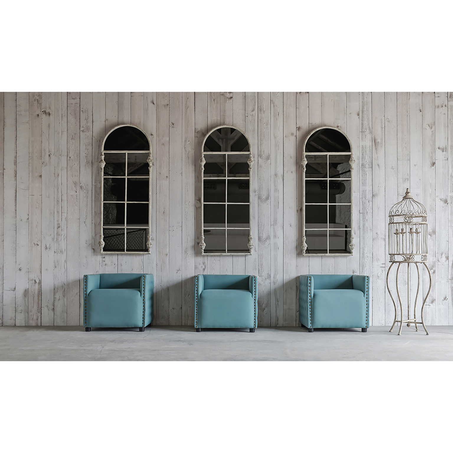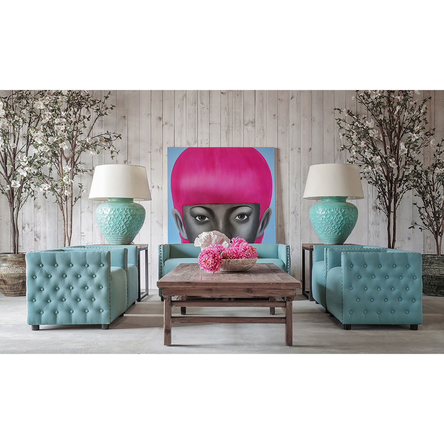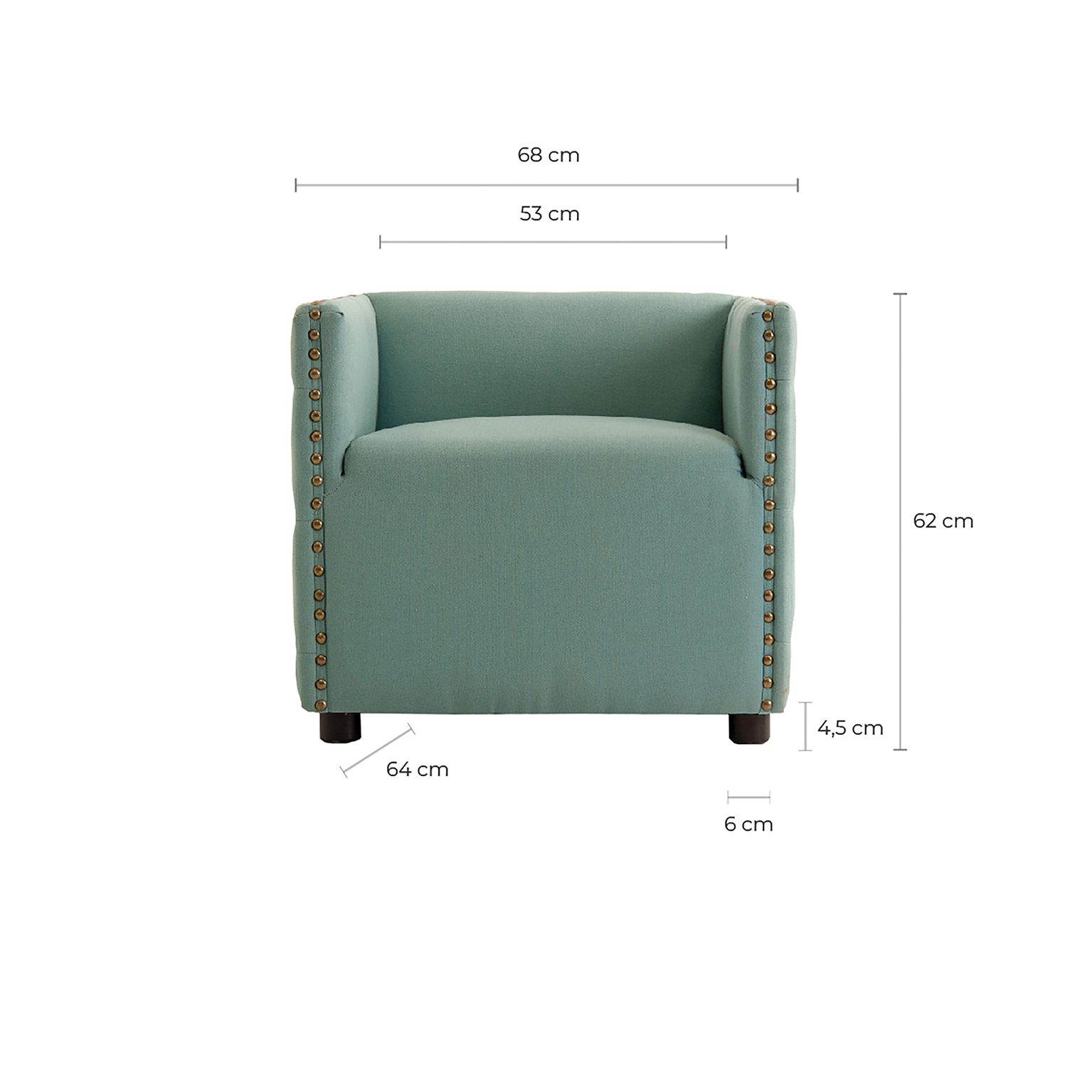 SILLÓN BURCIN, EN COLOR TURQUESA, DE ESTILO VINTAGE. FABRICADO EN LONETA, COMBINADO CON DM. TACHUELAS EN ORO VIEJO Y PATAS EN NEGRO. PRODUCTO DESMONTABLE.