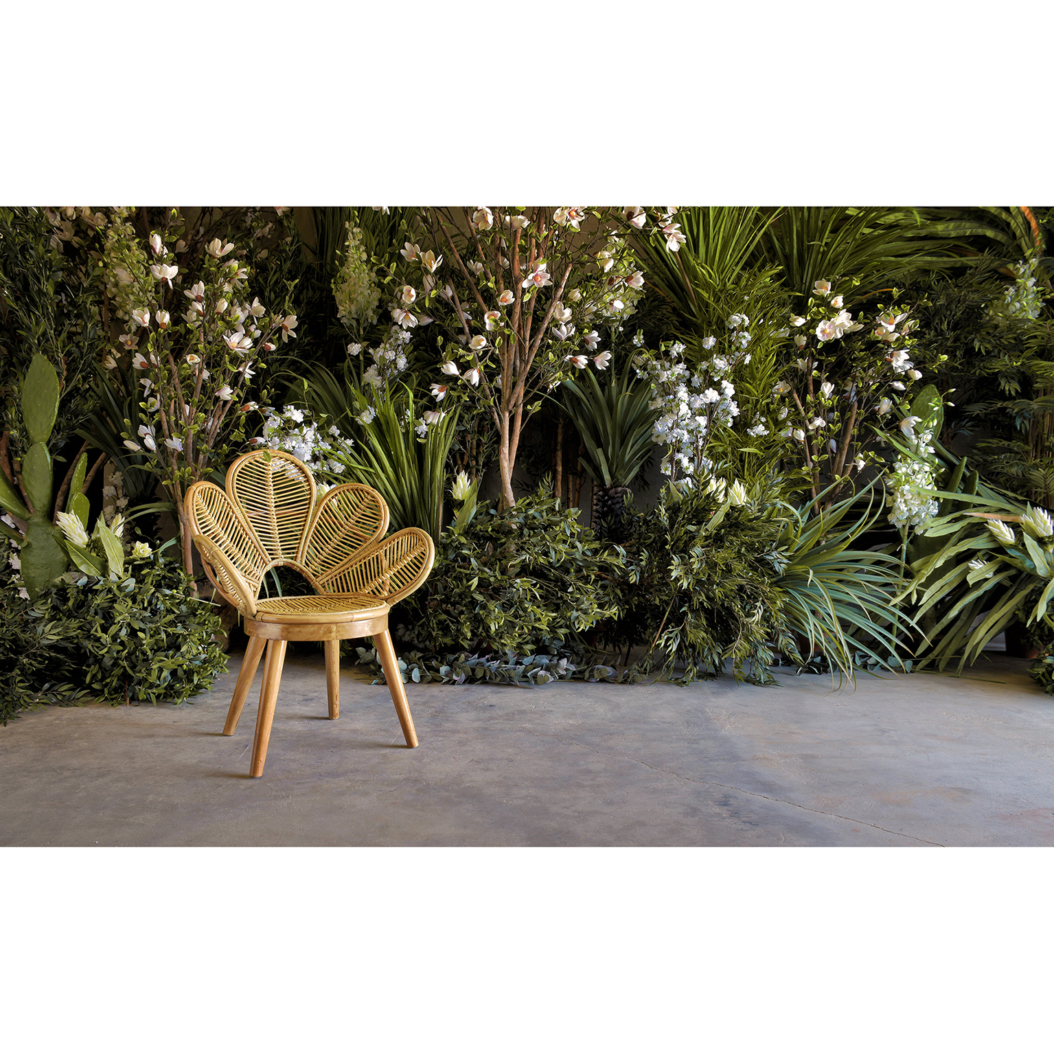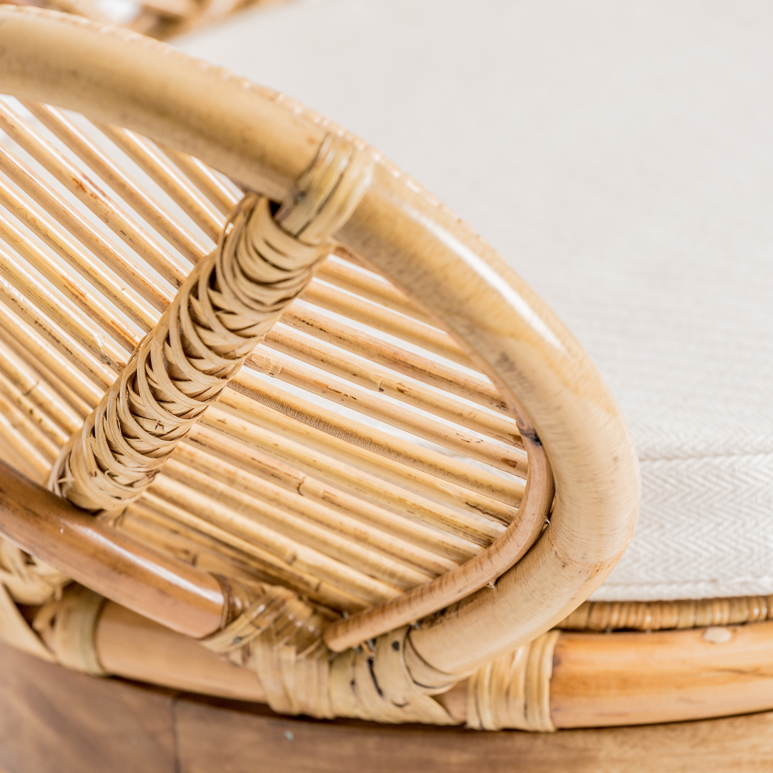 SILLÓN LLUC, EN COLOR NATURAL, DE ESTILO CONTEMPORÁNEO. FABRICADO EN RATÁN, COMBINADO CON MADERA DE MAHOGANY Y ESPUMA.