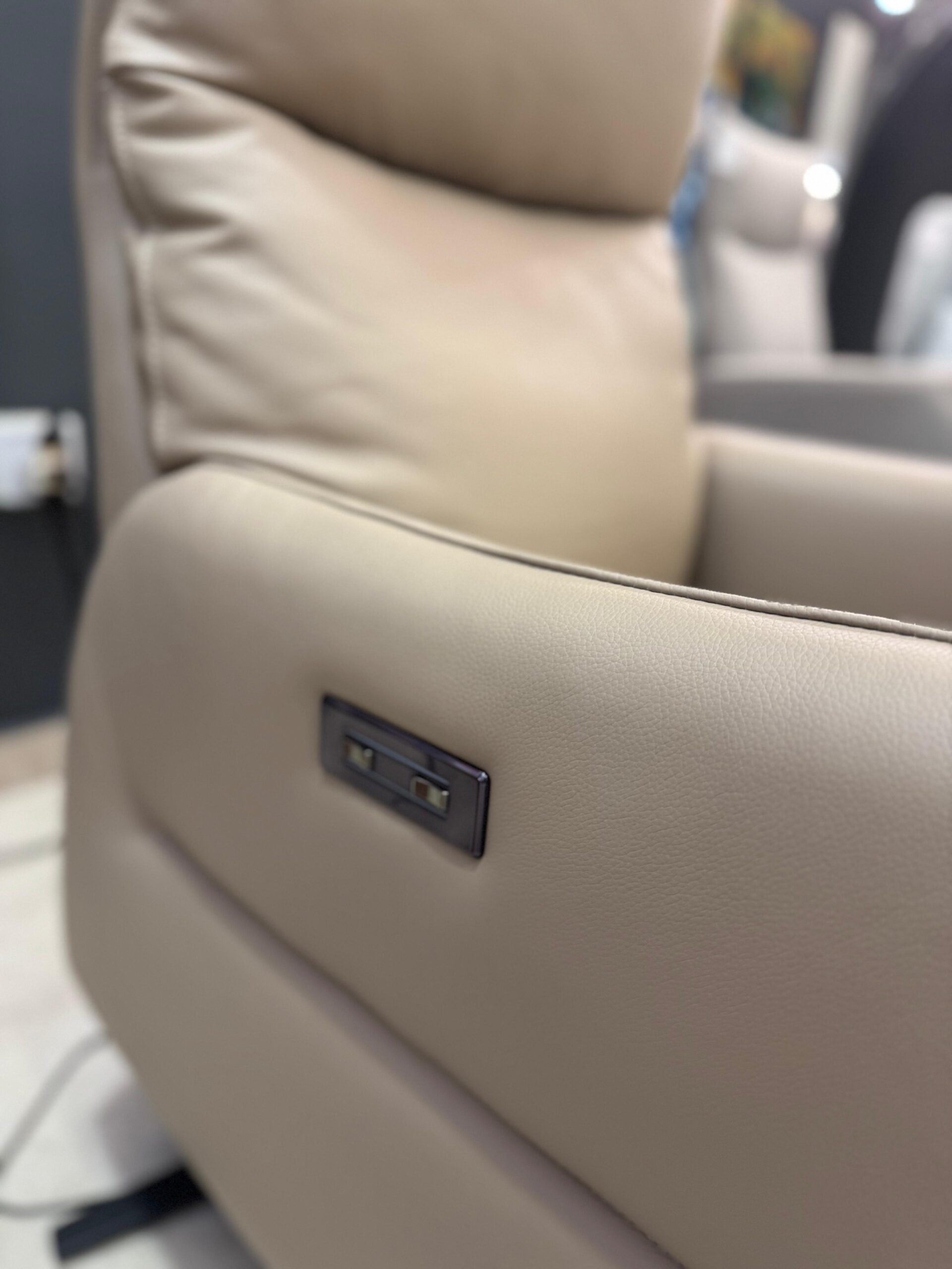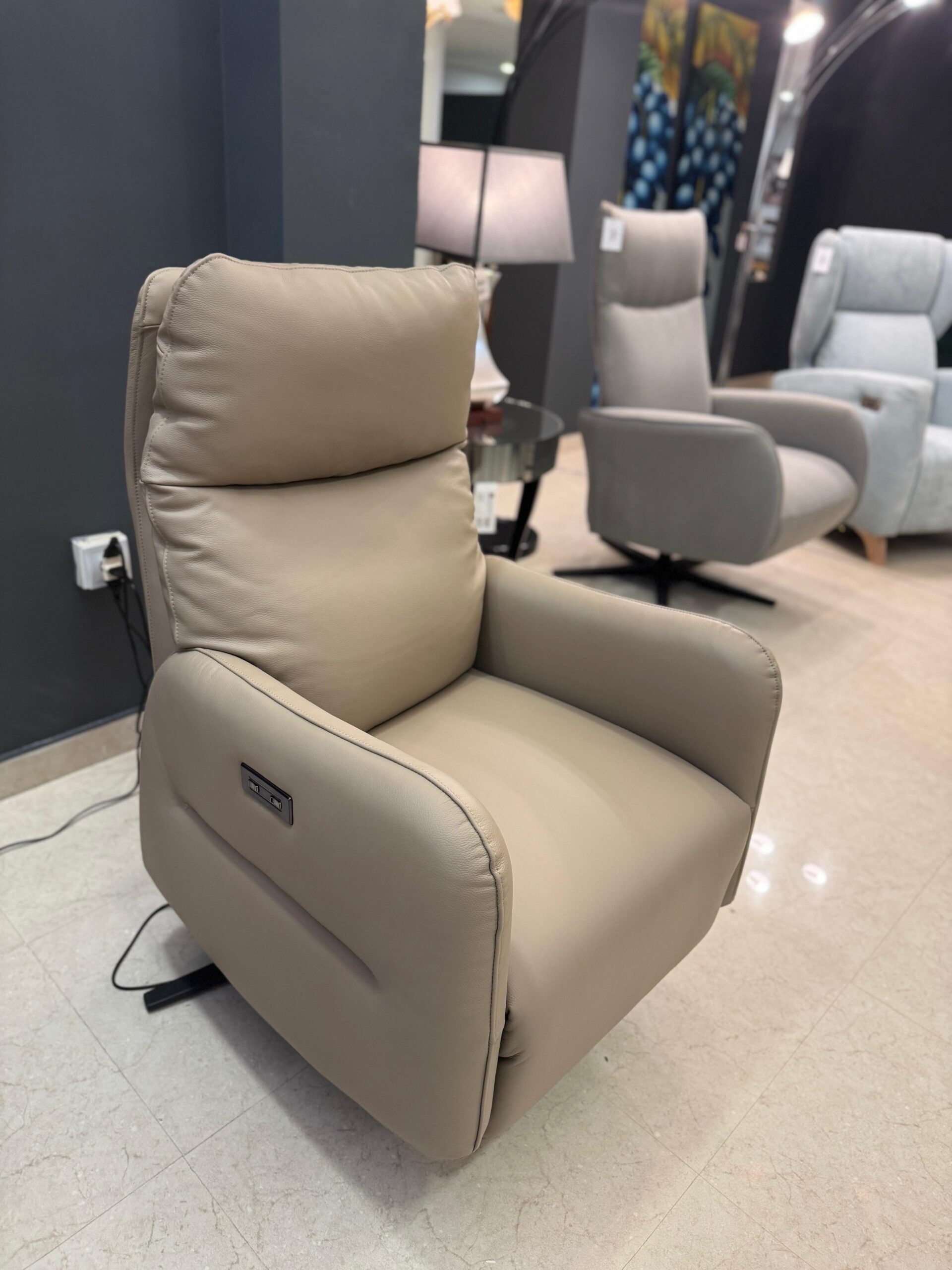 Sillón relax con dos motores giratorio con aspas color negro, tapizado en piel color taupe.